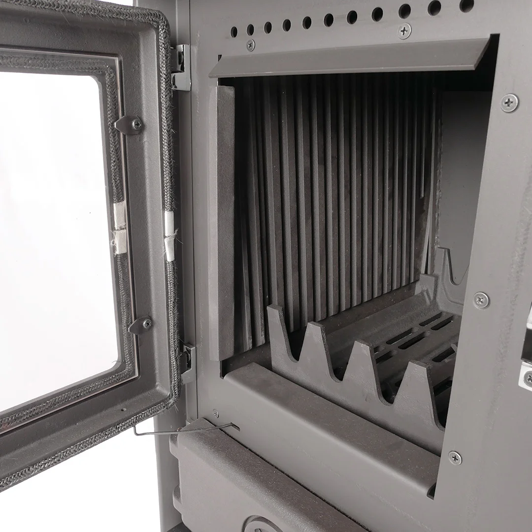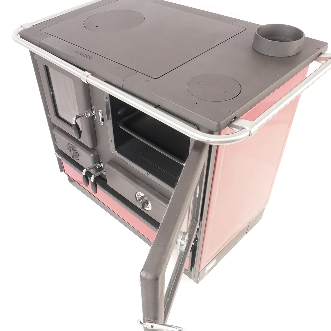 Дровяная кухонная плита предназначена для отопления небольших дачных домов и приготовления пищи. Печь изготовлена из чугуна и эмалированной стали. Эмалированное покрытие обеспечивает продолжительный срок службы печи и отвечает за эстетичный внешний вид. Доступно четыре цвета эмалированного покрытия: красный, кремовый, бордовый и черный. Печь укомплектована большой чугунной варочной поверхностью с одной конфоркой и стальным эмалированным духовым шкафом для приготовления пищи. Духовой шкаф габаритами 270х350х470 мм оснащён протвенем и датчиком температуры. Для подключения к системе водяного отопления используется теплообменник-змеевик объёмом 11 л и мощностью 10,2 кВт. Общая мощность печи 14,3 кВт. Топочная камера состоит из чугунных плит. Дверцы топки и духовки укомплектованы термостойкой стеклокерамикой. Замок и уплотнительный шнур обеспечивают герметичное закрывание дверец. Проём для загрузки дров 325х320х400 мм. Ящик для золы спрятан за герметичной чугунной дверцей. Дверца зольника снабжена устройством точной регулировкой подачи воздуха в топочную камеру. Колосниковая решетка подвижная для встряхивания золы. Для подключения к дымоходу предусмотрен патрубок, который монтируется на верхней и задней части плиты, справа или слева.