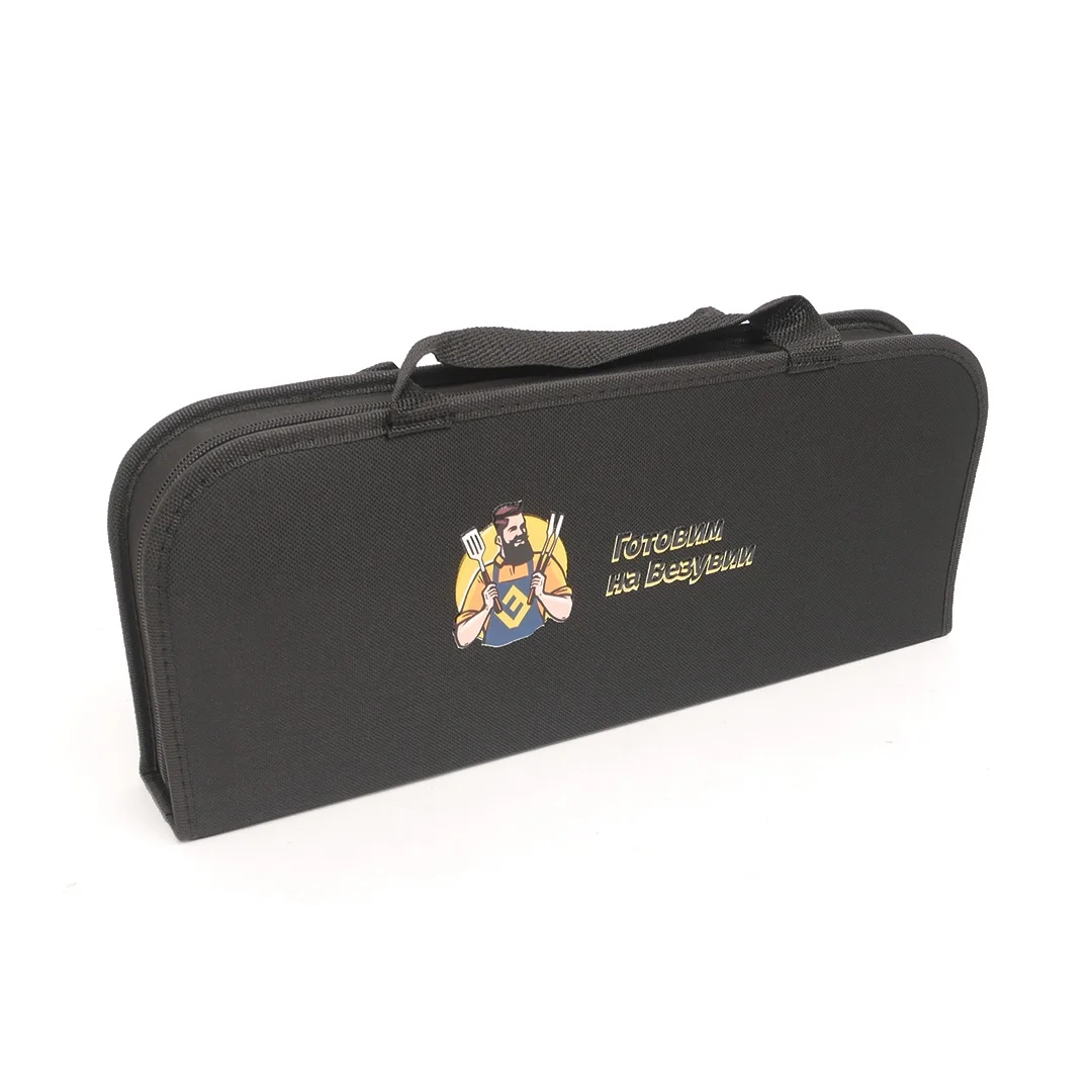 Состав: Щипцы, лопатка, вилка для гриля, щетка для гриля, кисточка для смазывания, коврик для барбекю, тканевый пенал для переноски.