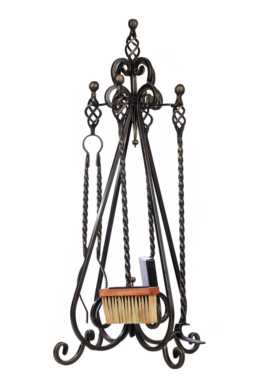 Все элементы выполнены из стального кованного квадрата. Витой дизайн набора делает его лёгким и изящным на вид.Набор выпускается в чёрном цвете, а так же с патинированием бронзовой или серебряной краской.Элементы набора устанавливаются на устойчивой подставке и размещаются рядом с печью или камином. Для перемещения набора предусмотрено кольцо в верхней части подставки.