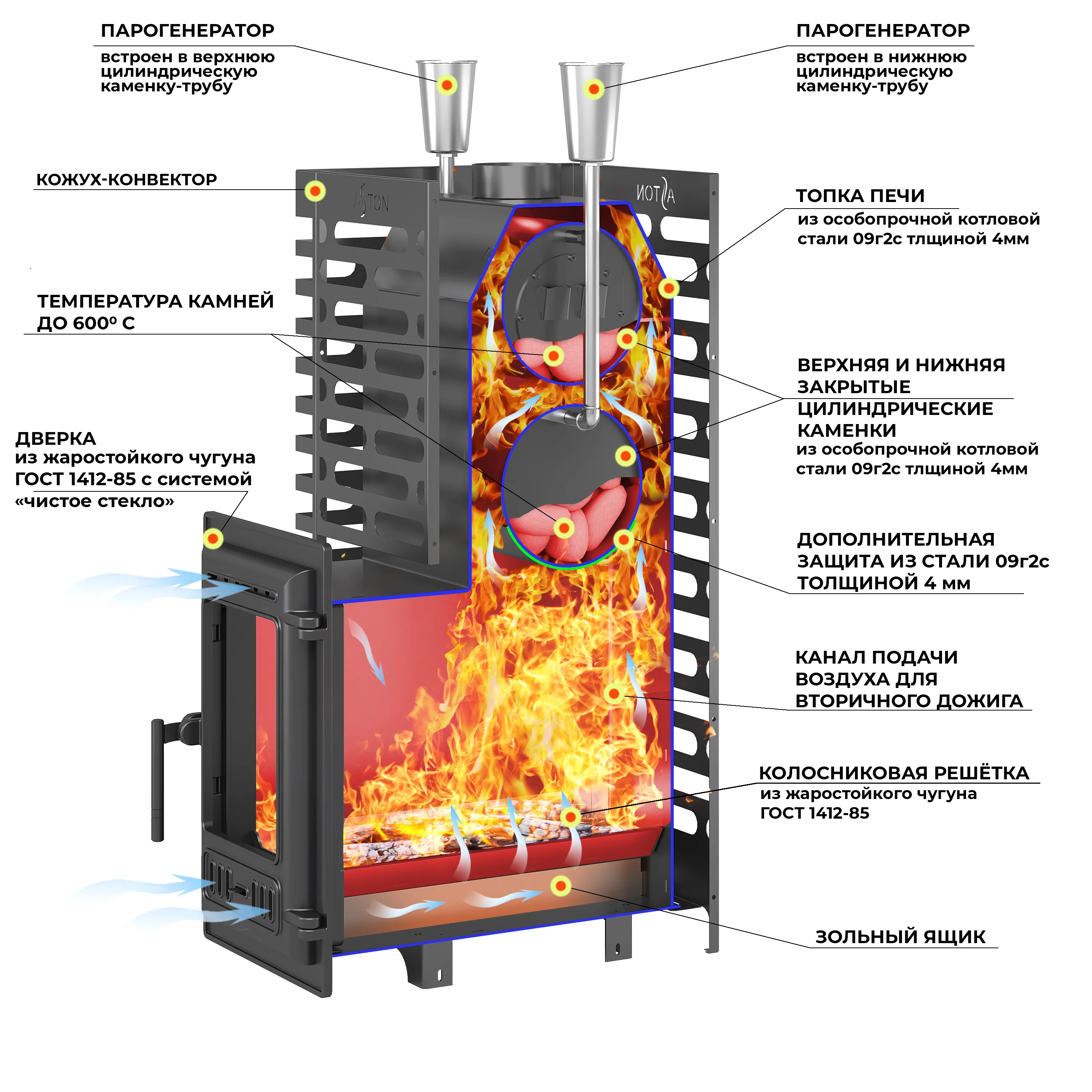ASTON — бренд банных печей для бюджетных парных и бань-бочек. Несмотря на доступную цену, их конструкция очень интересна: