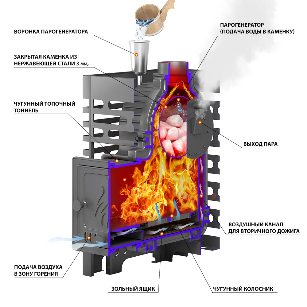 - Закрытая каменка из нержавейки, размещённая в самом горячем месте печи.