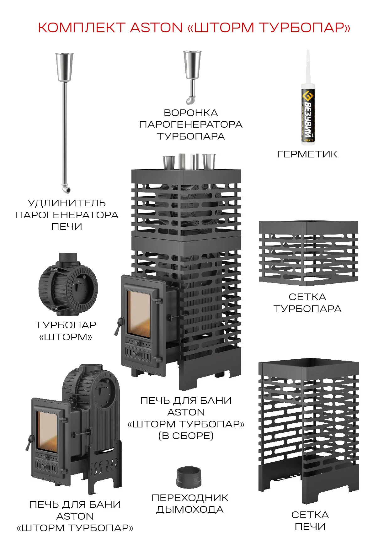 Комплект состоит из чугунной банной печи Астон Шторм 18 и чугунной натрубной каменки Турбопар. Объединение двух конструкций в единую систему заметно увеличивает тепловую отдачу термоагрегата, предотвращает перегрев дымохода, организует дополнительную каменку для получения качественного пара.