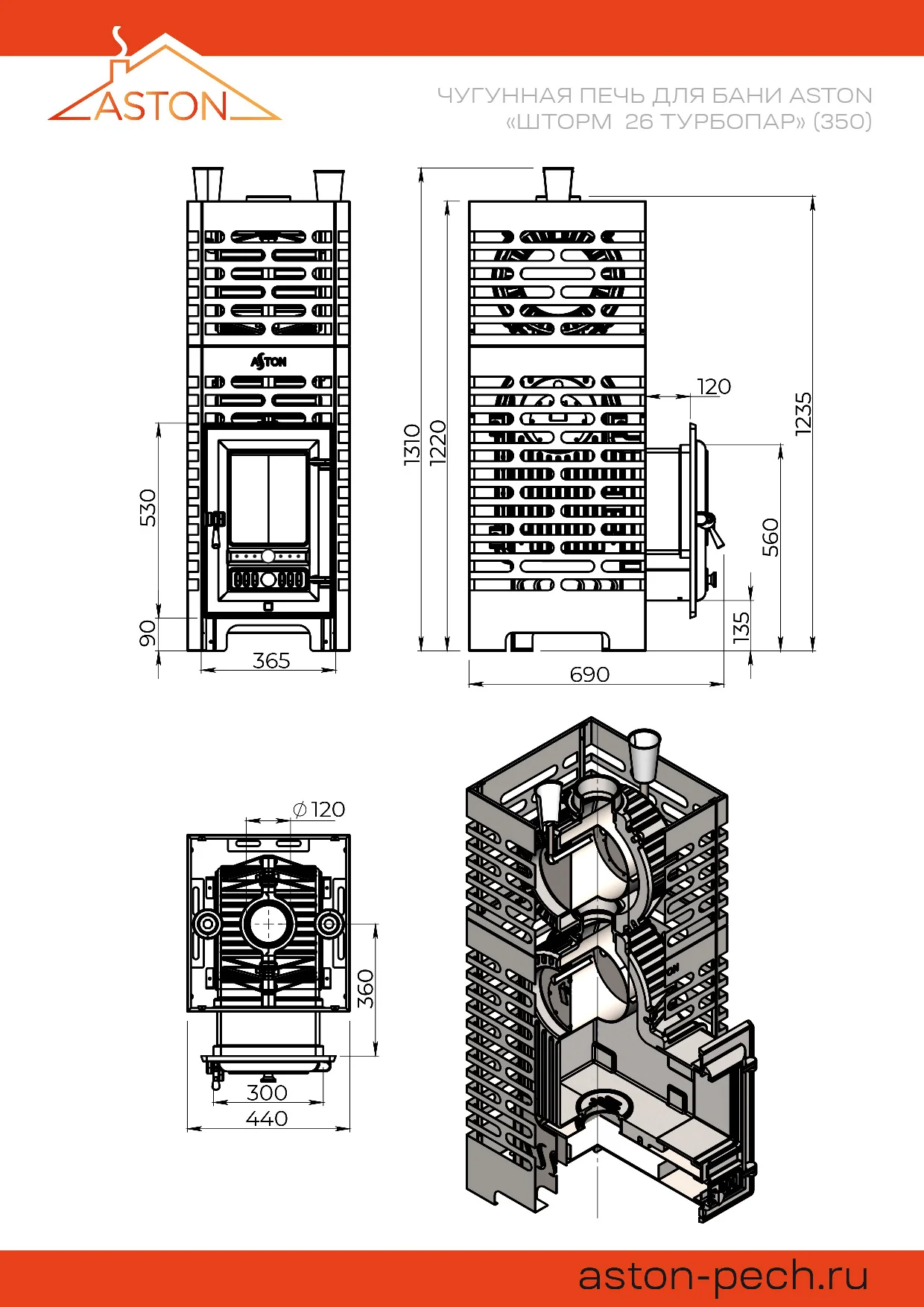 Чугунная печь Астон Шторм 18 состоит из двух вертикальных полукорпусов, соединяющихся на болтах. Система соединения паз-гребень обеспечивает герметичность топочной камеры даже при сильном длительном нагреве печи. Качественный чугун позволяет накапливать много энергии от горения дров и быстро передавать её камням, размещённым внутри печи и в сетке вокруг теплового агрегата.