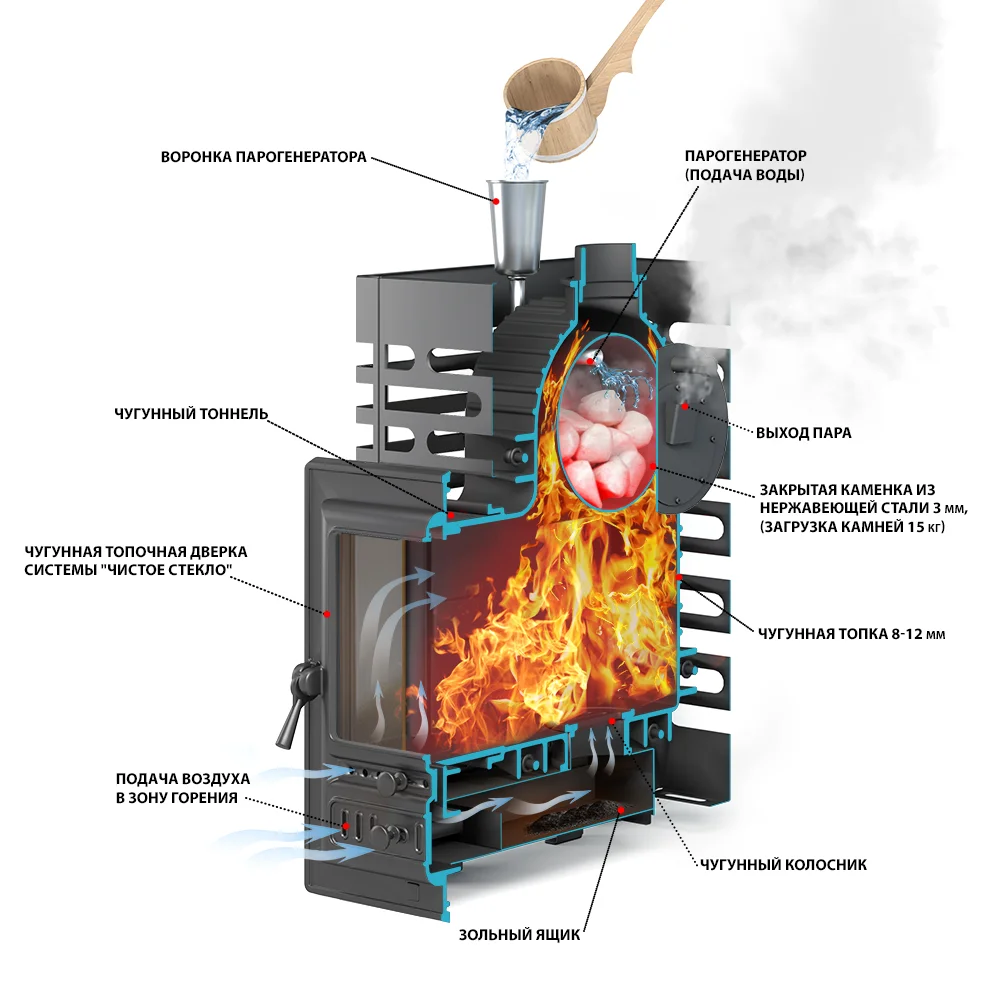 Уже первая протопка чугунного АСТОНа привела нас в восторг — отличный пар, устойчивые температуры, любые режимы работы, от хамама до сауны — и это только начало испытаний. ASTON быстро разгоняется до рабочих температур, долго удерживает тепло, плавно и мощно нагревает камни в сетке-кожухе.