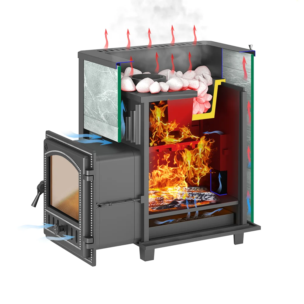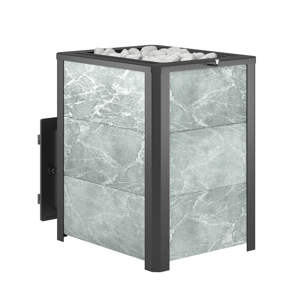 Чугунная банная печь EVEREST 24 в облицовке из натурального камня.Большая мощность, эстетичный внешний вид, высокая теплоёмкость, вместительная каменка — вот ключевые отличия сборной чугунной печи EVEREST 24.Печь рассчитана на объём парного отделения от 14 до 26 кубических метров.Облицовка выполнена из натурального камня талькохлорит толщиной 20 мм. Облицовка предназначена для обустройства открытой каменки, повышения теплоёмкости печи, выравнивания скорости нагрева парной.