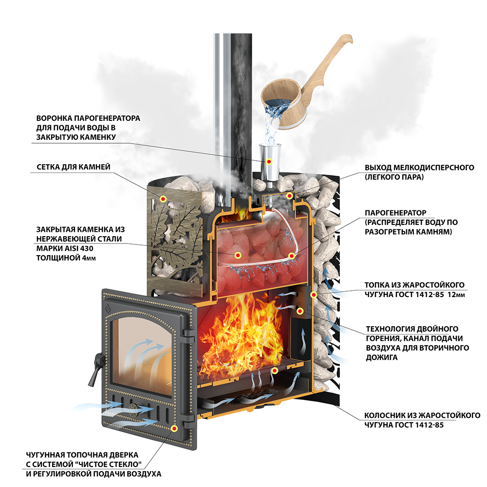 В комплектацию входит: Сборная печь со съёмным топочным тоннелем и чугунной дверкой.Цилиндрическая закрытая каменка из нержавеющей стали марки AISI 430, рассчитанная на загрузку 35-40 кг камней мелкой фракции.Система капельной подачи воды на камни закрытой каменки.Канал для подачи воздуха в область вторичного дожига.Массивный чугунный колосник.Зольный ящик, выполненный из прочной стали, позволяющий оперативно проводить уборку печи.Стальной конвекционный кожух для укладывания камней.Термостойкий герметик для сборки печи.Инструкция по монтажу и эксплуатации.