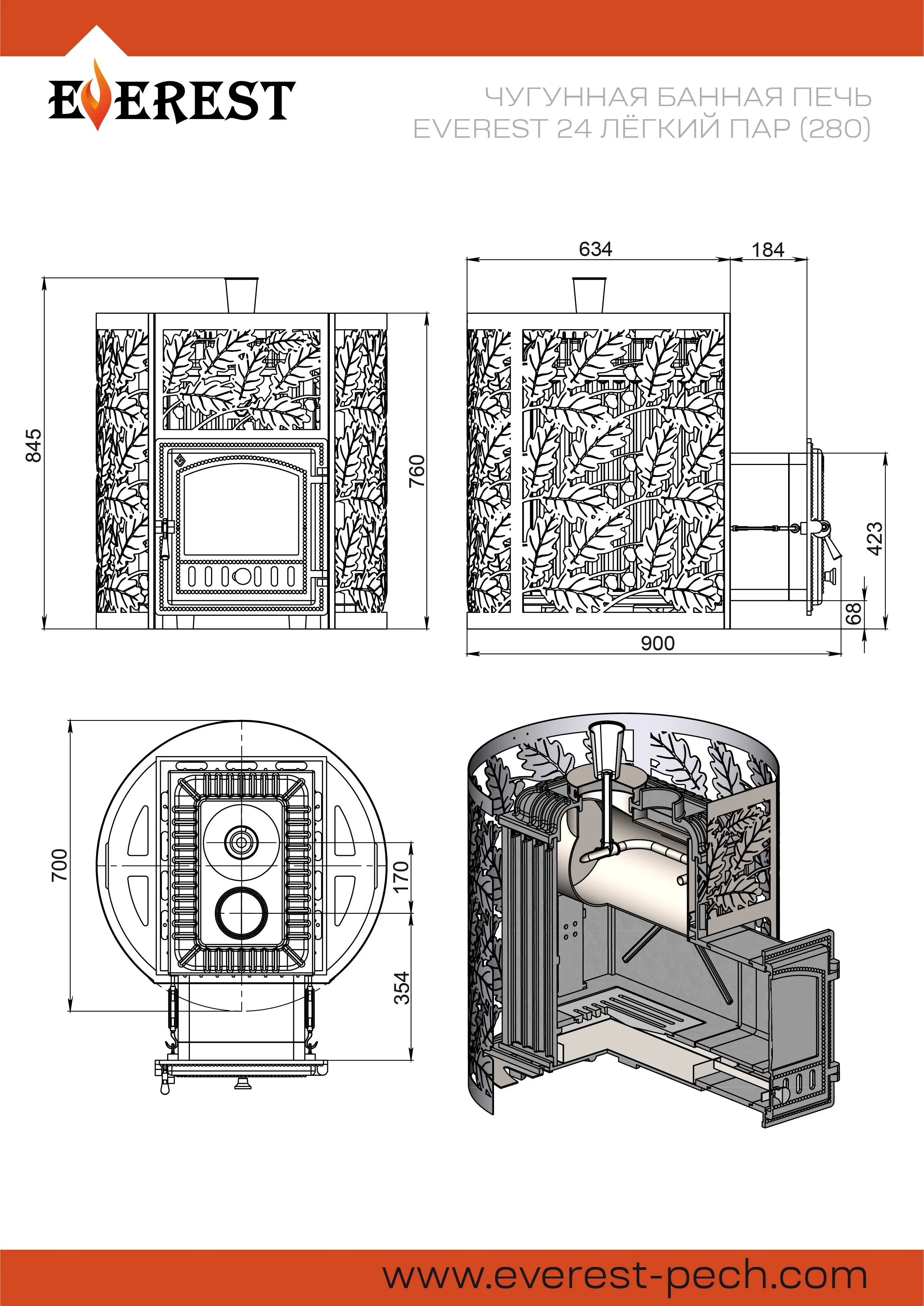 Банные печи Эверест Лёгкий Пар из жаропрочного чугуна отличает наличие закрытой каменки, выполненной из экологичной, экономичной нержавеющей стали марки AISI 430.Такое дополнение в обновленном ряду Эверест позволяет получить от печей серии Лёгкий Пар любую требуемую разновидность пара. Капельная подача воды, через специальную систему в закрытую каменку, позволяет получить качественный перегретый мелкодисперсный пар в нужных количествах, не боясь залива каменки. При этом лучшие характеристики линейки печей Эверест из жаропрочного чугуна остались на высоком уровне:заводской чугун оптимальной толщины;большая теплоёмкость;значительная мощность печи;простая для установки конструкция.