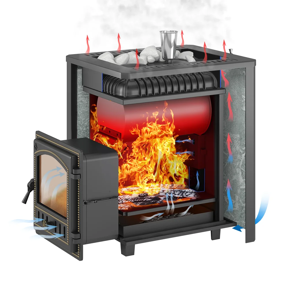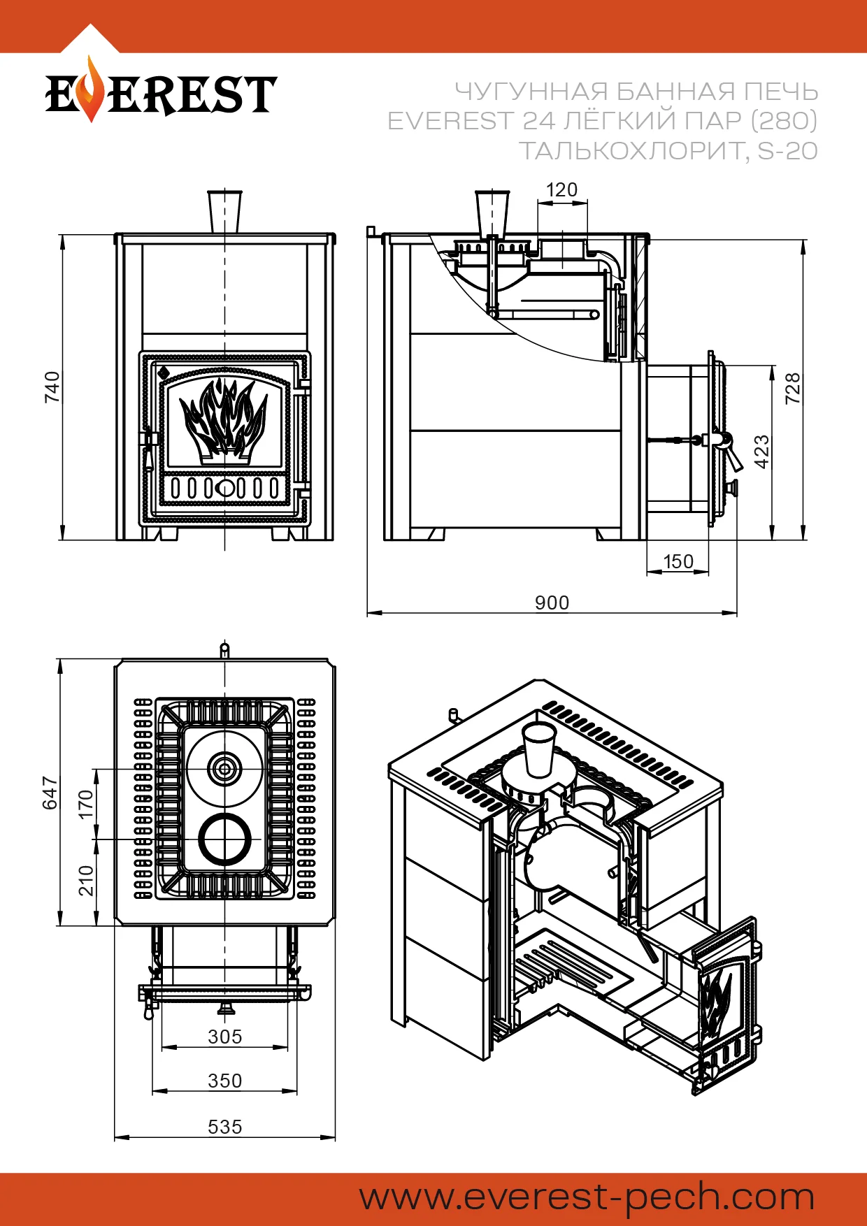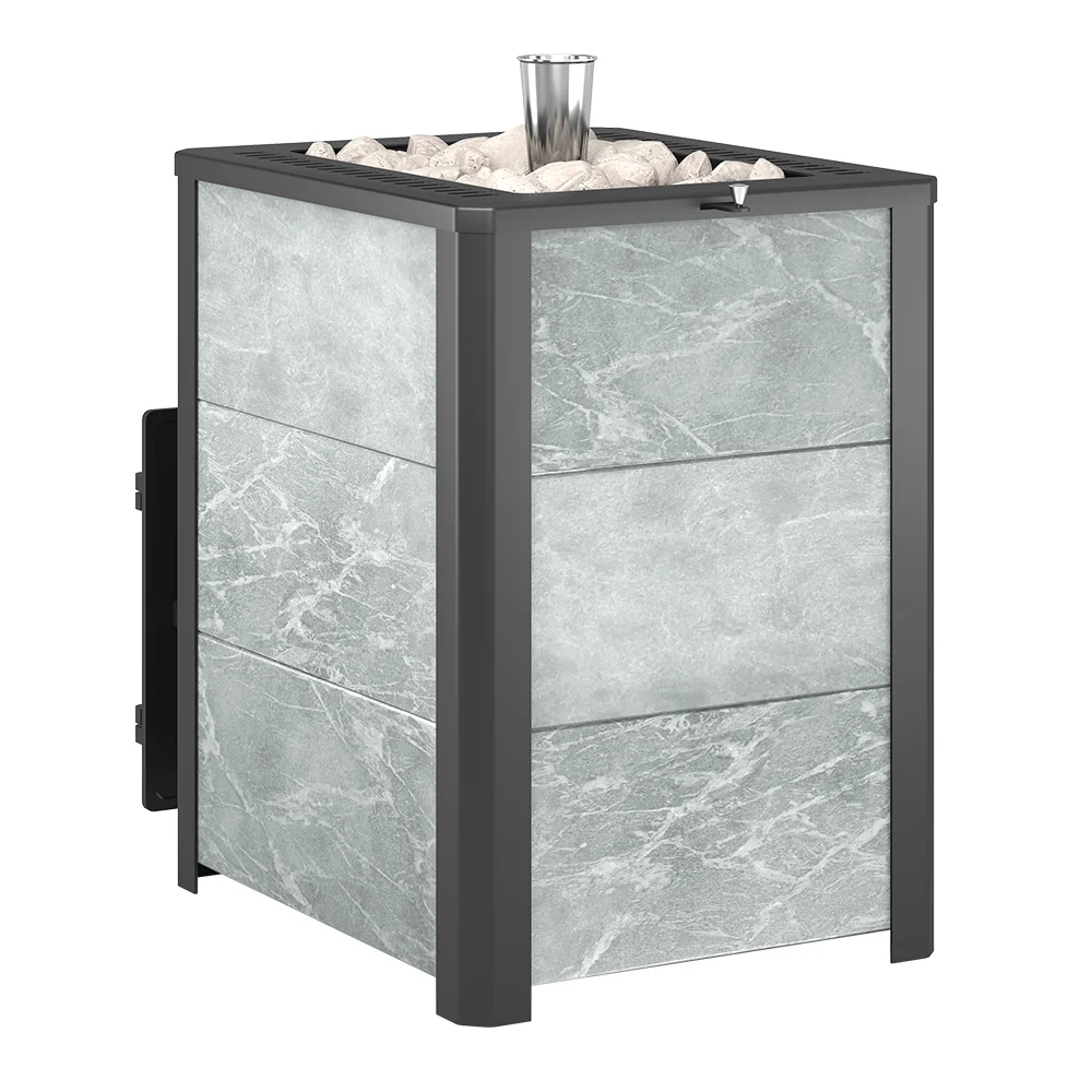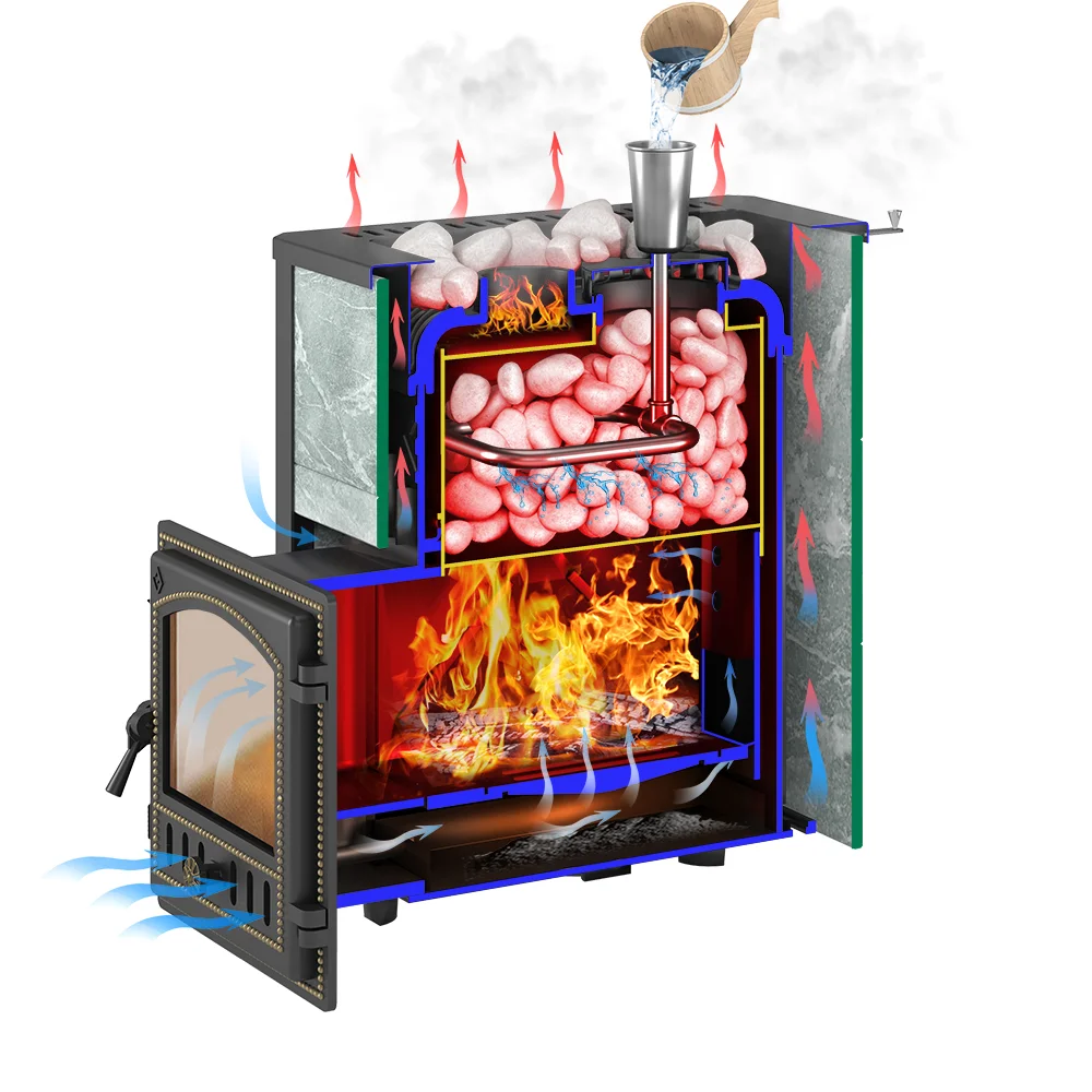 Банная печь Эверест 24 Лёгкий Пар Талькохлорит S -20 предназначена для прогрева парных помещений объёмом до 26 кубических метров.Топка печи сделана из жаростойкого чугуна (ГОСТ 1412-85), закрытая каменка — из нержавеющей стали AISI 430. Печь быстро нагревается и отлично передаёт тепло в окружающее пространство. Закрытая каменка расположена внутри топки, что ускоряет разогрев заложенного камня и нагревает камень до температур 550-600 градусов.Заклад закрытой каменки позволяет получать мелкодисперсный пар, характерный для режимов русской бани.Облицовка из плиток талькохлорита накапливает тепло, равномерно и постепенно передаёт его в парилку, обеспечивая плавный мягкий нагрев воздуха. Плитка закреплена на стальном каркасе и образует конвекционный кожух, усиливающий движение тепловых потоков.Для регулировки конвекции в верхней части каркаса расположена система щелевых отверстий, с помощью которых усиливается или перекрывается воздушный поток. Степень открывания отверстий зависит от необходимого режима работы парной, от сауны до влажной бани.