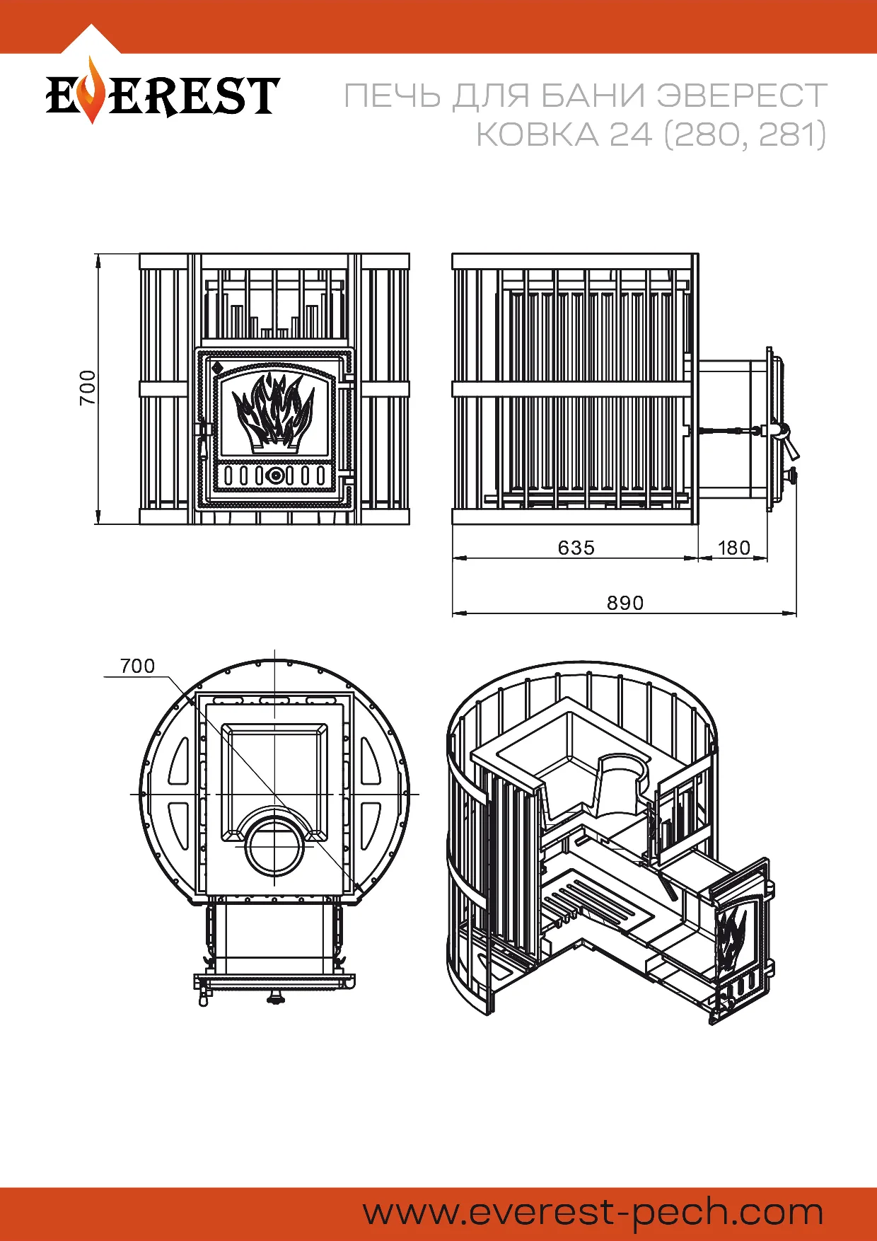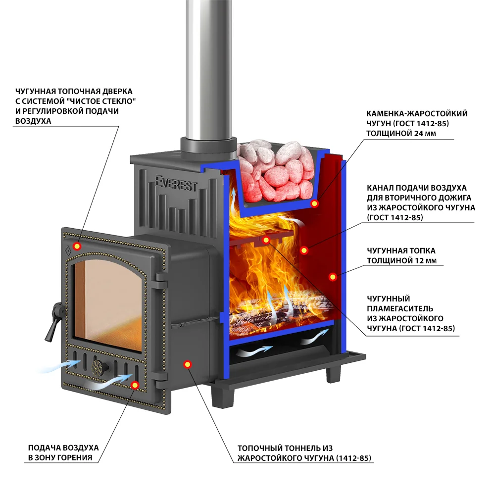 Большая мощность, эстетичный внешний вид, высокая теплоёмкость, вместительная каменка – вот ключевые отличия сборной чугунной печи Эверест 24.