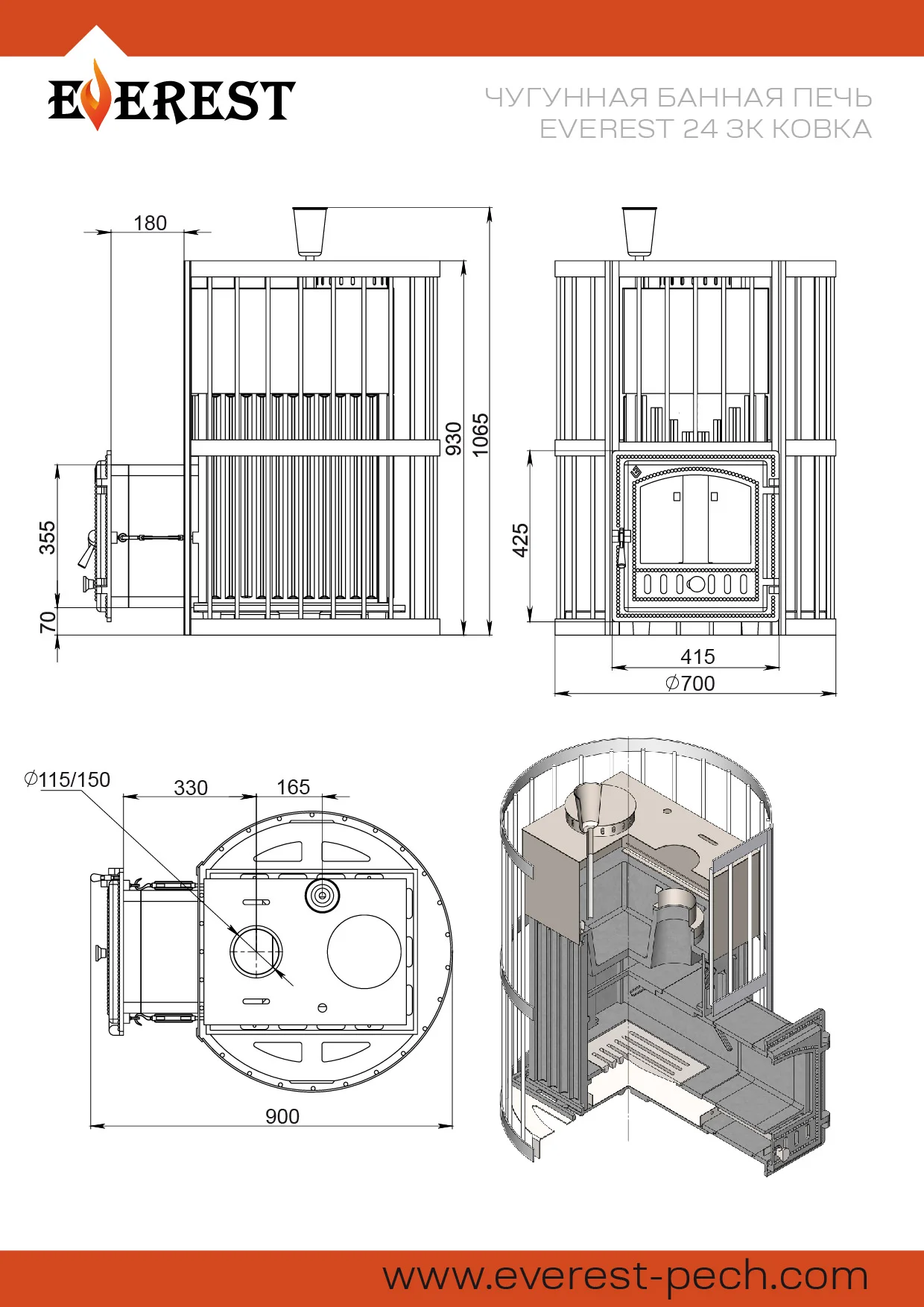 Чугунная банная печь Эверест 24 в кованной сетке с закрытой каменкой.Большая мощность, эстетичный внешний вид, высокая теплоёмкость, вместительная каменка – вот ключевые отличия сборной чугунной печи Эверест 24. Печь рассчитана на объём парного отделения от 15 до 25 кубических метров.Сетка сделана по комбинированной технологии, с использованием стального прутка и кованой стальной ленты. Декоративные элементы придают сетке элегантный внешний вид и хорошо вписываются в тематический банный дизайн. К основанию печи крепятся фасонные стальные детали, образующие поверхность для укладки камней. Сетка предназначена для обустройства открытой каменки, повышения теплоёмкости печи, выравнивания скорости нагрева парной.Наполнение сетки камнями помогает защитить парильщиков от жёсткого инфракрасного излучения, возникающего при нагреве металлической поверхности печи. Сетка вмещает в себя 240-280 килограммов камней крупной и средней фракции.Закрытая каменка – приспособление на банной печи, предназначенное для получения большого количества мелкодисперсного пара. Конструктивно закрытая каменка представляет собой сварной стальной короб, который размещается на верхней части печи и заполняется камнями. В таком объёме каменки умещается до 45 килограммов камней крупной и средней фракции.Камни в закрытой каменке нагреваются снизу, и поэтому для получения большого количества пара идеальной будет подача жидкости в середину и на нижнюю часть камней. Такая подача обеспечивается за счёт парогенератора, воронка которого расположена рядом с дверкой. Заливающаяся в воронку вода через отверстия в трубке попадает вовнутрь массива максимально разогретых камней.Быстрое испарение воды с этих камней и образует значительное количество мелкодисперсного пара. Кроме парогенератора для получения пара можно воспользоваться дверкой и подавать воду через неё на верхние слои каменной закладки. В этом случае на выходе будет получаться обычный пар, только в несколько большем количестве.Пар в парильное помещение можно выпускать как через сдвижную створку, размещённую в дверке, так и с помощью открытия самой дверки.