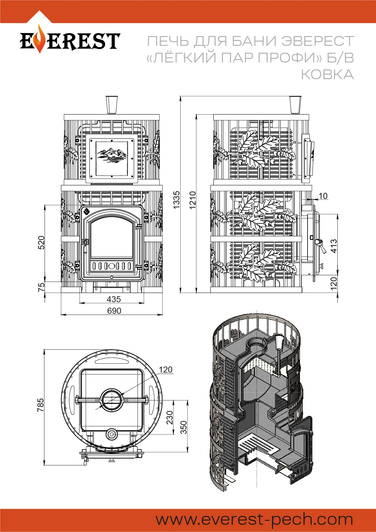 Поворотная чугунная банная печь EVEREST Лёгкий Пар ПРОФИ предназначена для обогрева парных помещений объёмом до 40 кубических метров и получения пара при эксплуатации в частных и коммерческих банях.