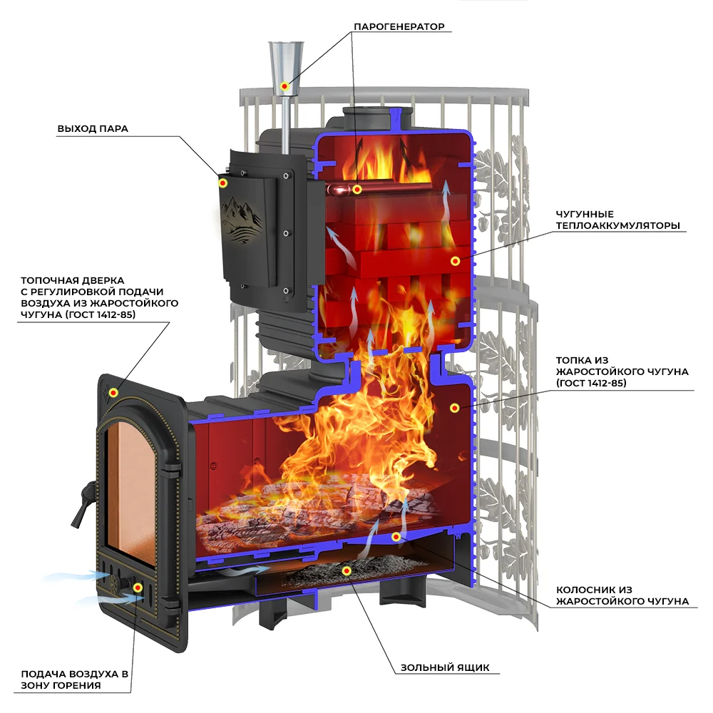 Печь состоит из двух модулей: топочной камеры и закрытой каменки из чугуна. Наиболее термонагруженные участки печи сделаны из жаропрочного чугуна толщиной 20 миллиметров.