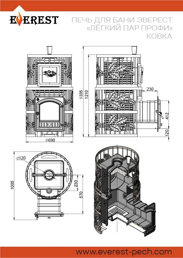Поворотная чугунная банная печь EVEREST Лёгкий Пар ПРОФИ предназначена для обогрева парных помещений объёмом до 40 кубических метров и получения пара при эксплуатации в частных и коммерческих банях.