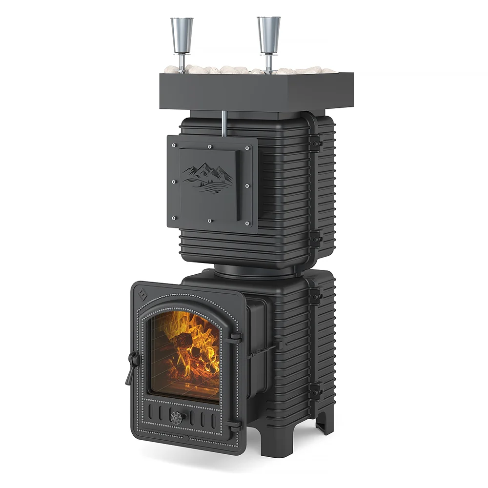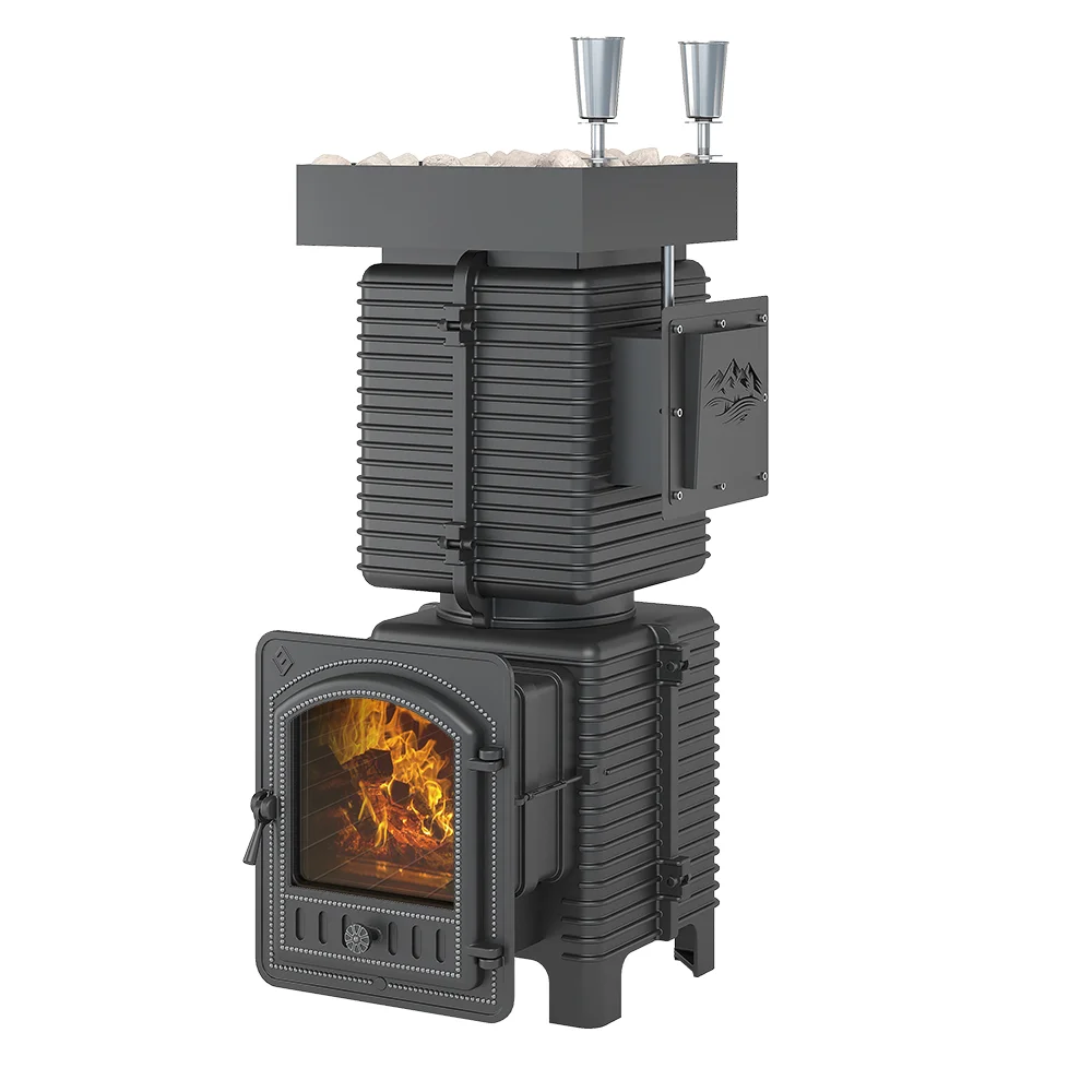 Закрытая каменка из чугуна толщиной 10 миллиметров сверху и снизу имеет закруглённую конструкцию. Каменка находится на месте пламегасителя. Закрытая каменка рассчитана на размещение 60 килограммов камней. В качестве открытой каменки выше основной части печи размещён стальной поддон для камней, куда умещается более 60кг камней. Совокупный вес печи и камней составляет более 400 кг.