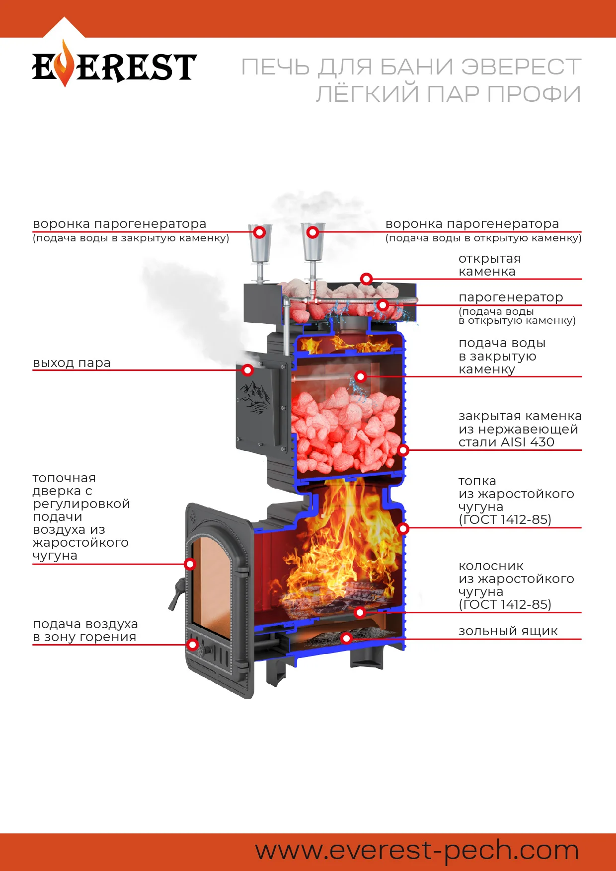 Печь состоит из двух модулей: топочной камеры из чугуна и закрытой каменки из нержавеющей стали. Наиболее термонагруженные участки печи сделаны из жаропрочного чугуна толщиной 20 мм.Для увеличения площади теплоотдачи по всей поверхности печи устроено оребрение, за счёт которого чугун быстрее отдаёт тепло в окружающее пространство и способствует ускорению нагрева парной, каменного заклада и облицовки печи.Топочная часть и каменка при установке печи могут быть повёрнуты друг относительно друга. Это позволяет направить отверстие каменки в парилке в удобную сторону. После установки на место каменка и топка соединяются между собой при помощи герметика и термостойкого шнура.Закрытая каменка из нержавеющей стали толщиной 4 мм сверху и снизу имеет закруглённую конструкцию. Каменка находится на месте пламегасителя. Огонь при горении дров охватывает каменку с четырёх сторон, что ускоряет нагрев заклада. Закрытая каменка рассчитана на размещение 60 кг камня для бани, создаёт массивный тепловой заряд. Внешний корпус изготовлен из чугуна, его части крепятся друг к другу по типу «паз-гребень» с использованием термостойкого герметика.В качестве открытой каменки выше основной части печи может быть размещён стальной поддон для камней, куда умещается более 60 кг камня. Совокупный вес печи и заклада составляет более 400 кг.Для получения пара обе каменки печи EVEREST Лёгкий Пар ПРОФИ оборудованы парогенераторами. Парогенератор закрытой каменки зафиксирован в корпусе печи, а парогенератор открытой каменки укладывается между камнями в верхнем поддоне.Чугунная дверка артикул 290 специально разработана для этой печи, обеспечивает регулировку подачи воздуха в широких пределах и безопасность использования печи, не деформируется при длительном нагреве.
