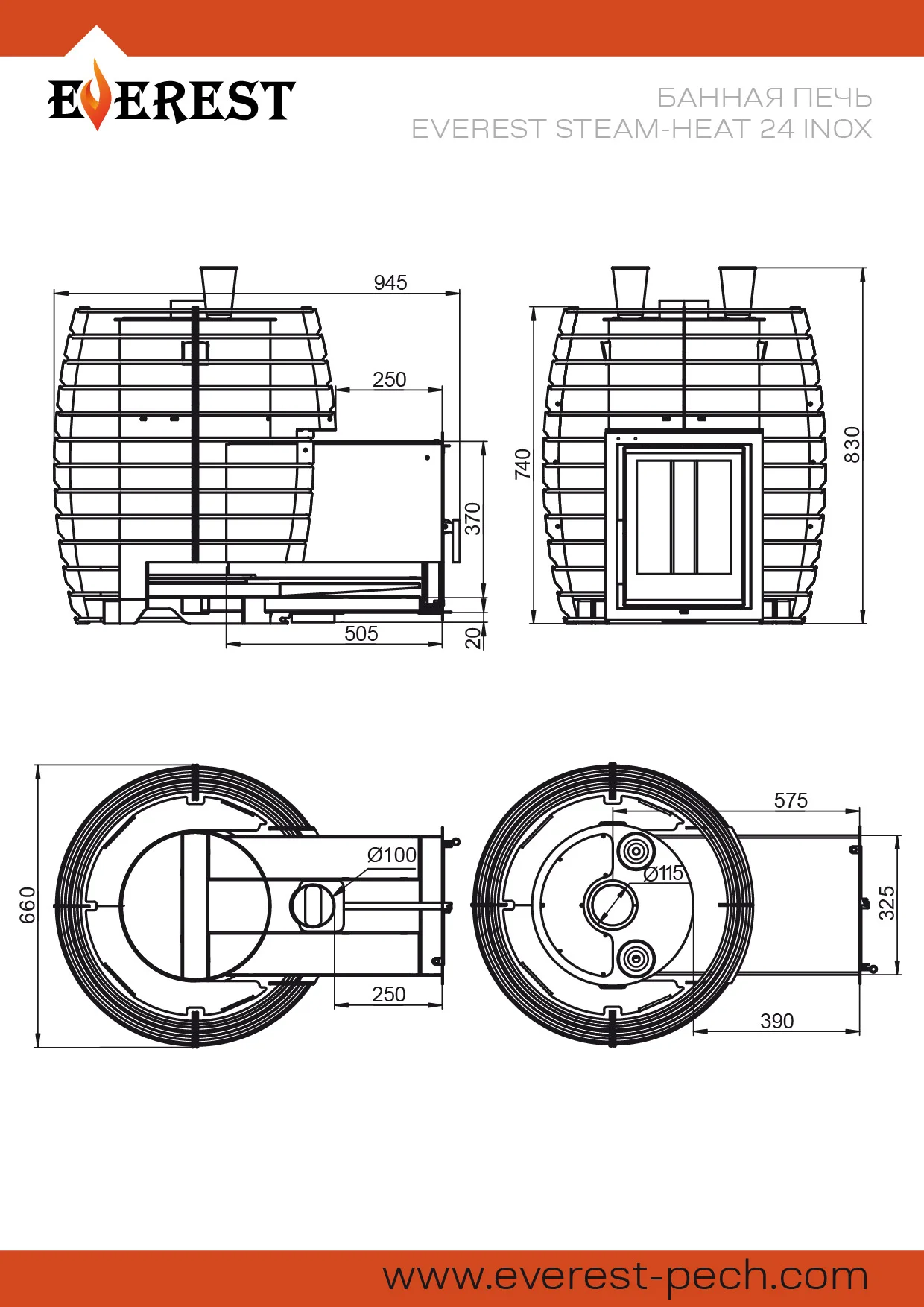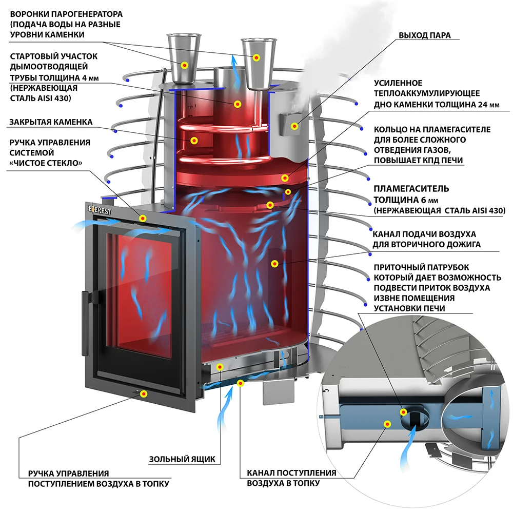 Сталь толщиной 24 мм, интегрированная каминная дверка, системы чистое стекло, вторичный дожиг, неповторимый дизайн и звук вьюги. Всё это - про новую печь для бани Эверест Steam-Нeat 24 INOX.