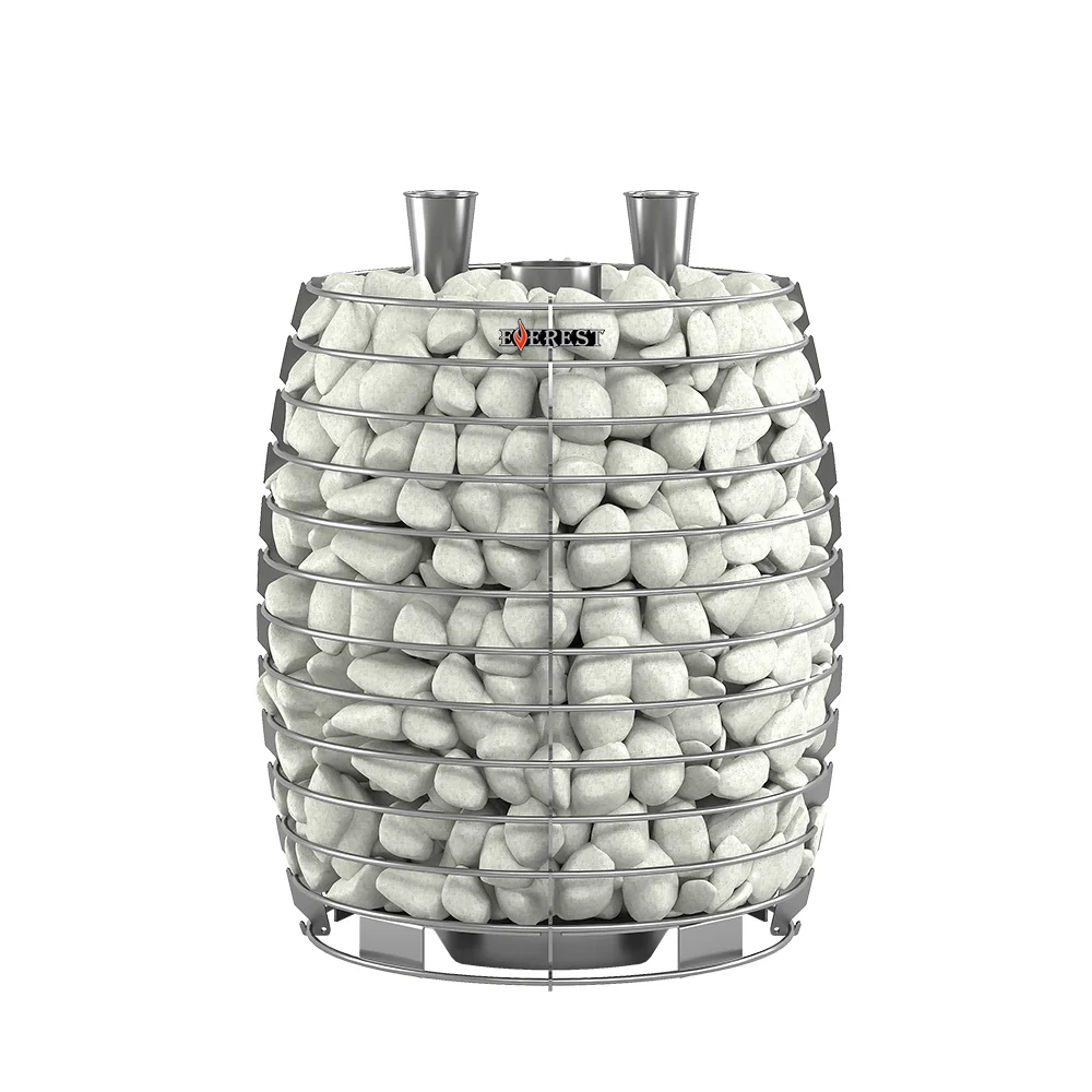 Печь изготовлена из стали 09г2с толщиной элементов от 3 до 24 мм в зависимости от участка. Мощностью 24 кВт, она с легкостью прогреет парную от 12 до 24 кубических метров. Усиленная кольцевая сетка конвектор прекрасно подчеркивает стиль и дизайн печи. В неё помещается около 140 – 200 кг камней в зависимости от их вида, плотности укладки и фракции.