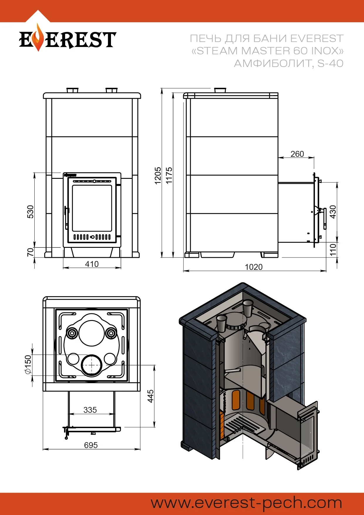 Печь для бани Эверест "Steam Master 60 INOX" Амфиболит, S-40 изготовлена из нержавеющей стали. Печь предназначена для установки в частные и коммерческие бани с объёмами парных помещений до 60 м³.