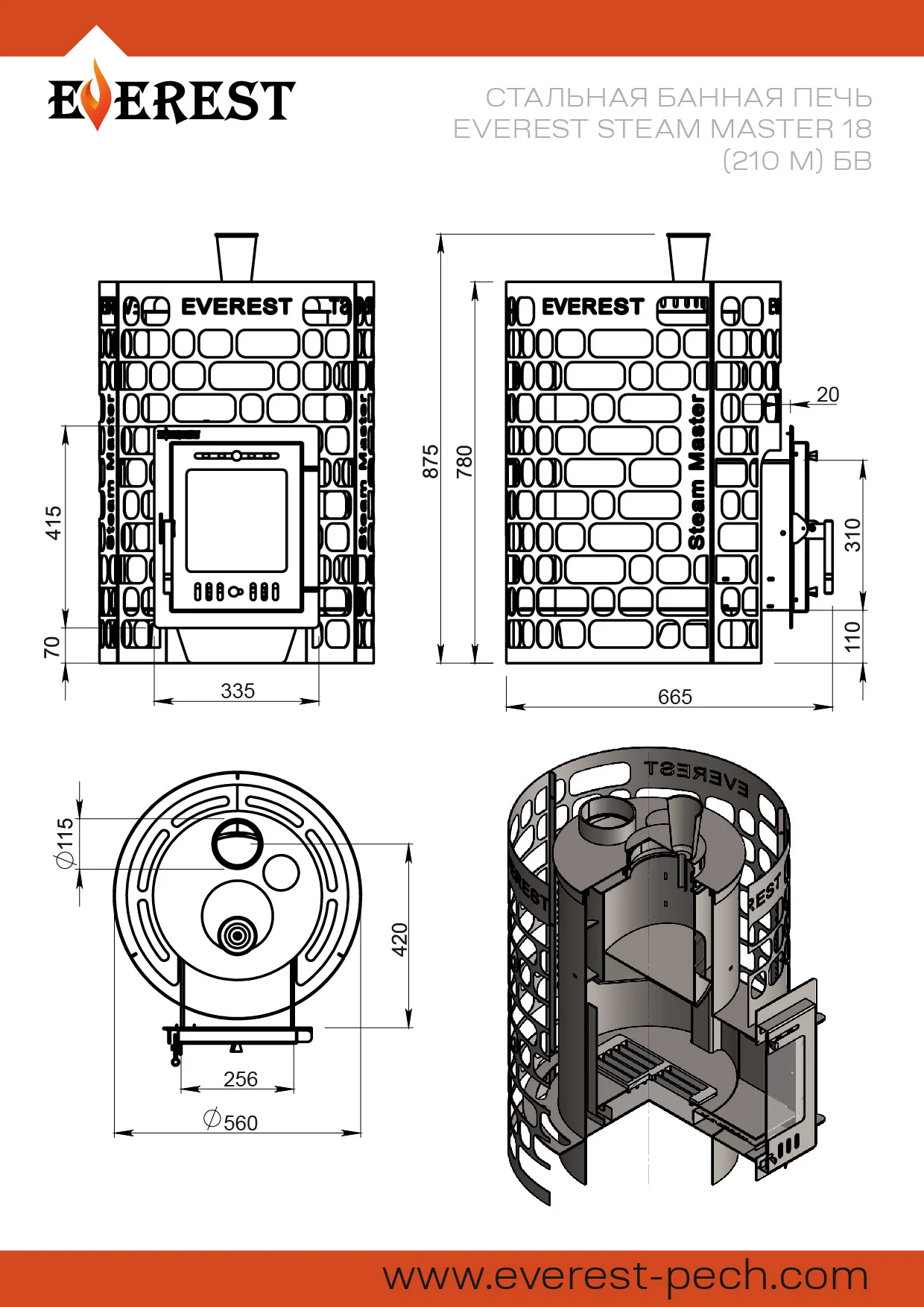Внешний тепловой контур образован открытой каменкой в виде цилиндрической сетки, вмещающей в себя 100 килограммов камней. Сетка сделана из стали, в новом минималистичном дизайне EVEREST.