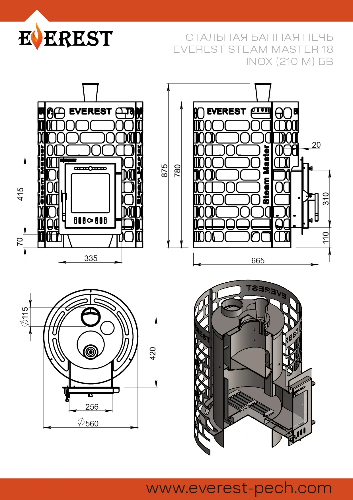 Печь для бани Эверест "Steam Master" 18 INOX (210М) б/в изготовлена из нержавеющей стали и предназначена для установки в частные и коммерческие бани с объёмами парных помещений от 8 до 18 м3.Печь и сетка внешней каменки цилиндрической формы, компактная и удобно размещаемая в парилке. Выносной тоннель при монтаже печи проводится через стену и предполагает обслуживание печи из смежного помещения.Конструкция печи включает в себя закрытую каменку из нержавейки марки AISI 430 толщиной 4 мм, расположенную в верхней части топки. Каменка оригинальной формы размещена прямо на пути пламени и дымовых газов, что позволяет нагреть камни до температур свыше 600 ºС.Для эффективного сгорания топлива по боковым сторонам топки предусмотрены два канала для подачи воздуха на вторичное горение.Каменка рассчитана на 15-20 кг камня для бани мелкой и средней фракции. Воду в каменку подают с помощью заливной воронки, через которую вода попадает примерно в середину массива уложенных камней. Пар выходит через верхнюю крышку с отверстиями. На этой крышке крепится воронка для подачи водыКрышка печи и каменка – съёмные элементы, позволяют ухаживать за топкой и каменкой. Форма каменки со скосом в передней части исключает накопление сажи сверху, на каменке. Сажа из дымохода по переднему краю каменки попадает в топку, где сгорает, не причиняя вреда печи, каменке и дымоходу.Печь подключается к дымоходу диаметром 115 мм.Стальная дверь артикул 210М оснащена системами подачи воздуха в колосниковую зону и на стекло. С помощью размещённых в двери отверстий можно регулировать интенсивность горения дров и обеспечивать чистоту стекла.Внешний тепловой контур образован открытой каменкой в виде цилиндрической сетки, вмещающей в себя ок. 100 кг камней. Сетка сделана из стали, в новом минималистичном дизайне EVEREST.