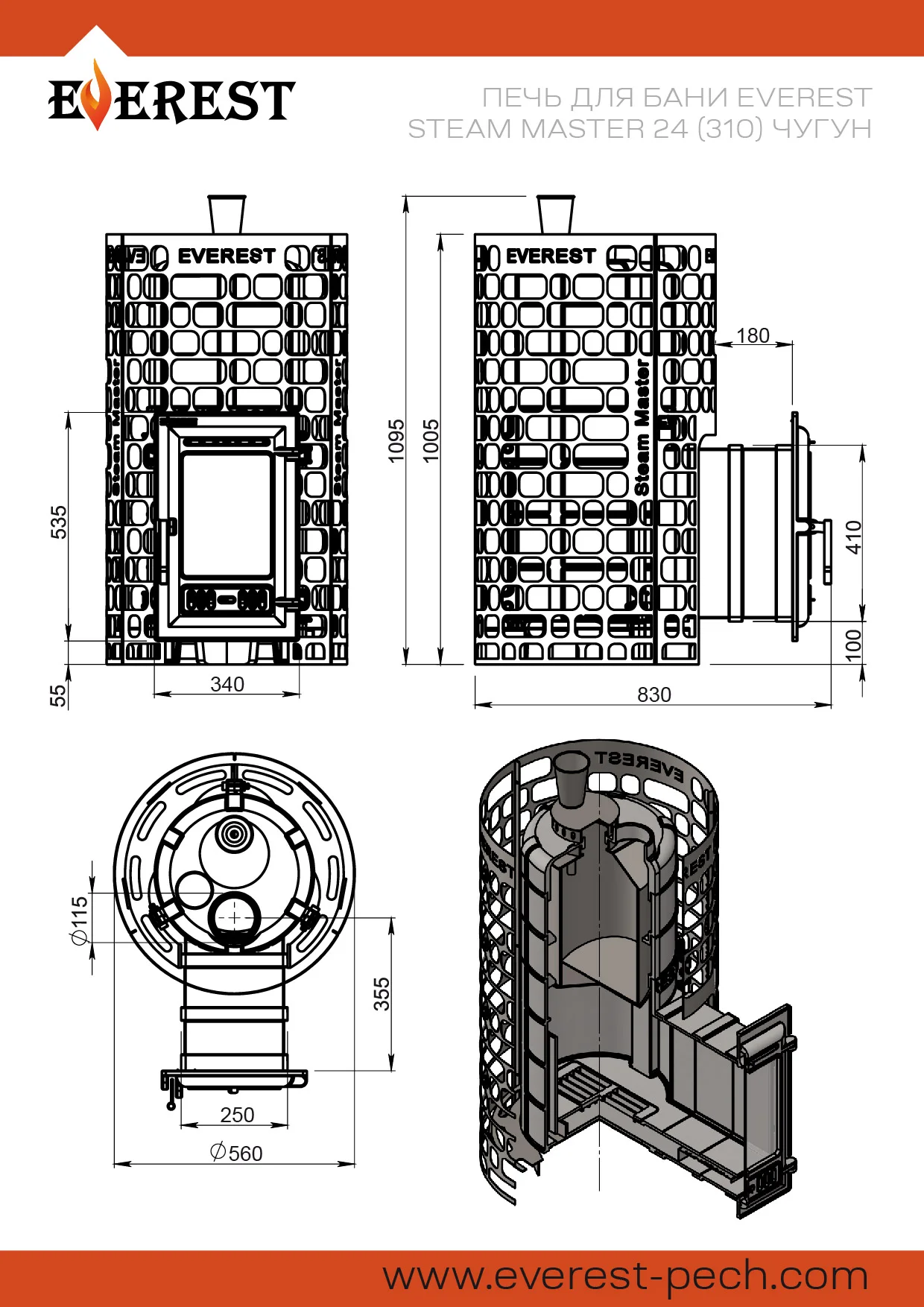 Верхняя часть топки изготовлена из чугунных колец. В печи Эверест "Steam Master" 24 (310) ЧУГУН между топкой и крышкой размещено одно кольцо высотой 120 миллиметров.