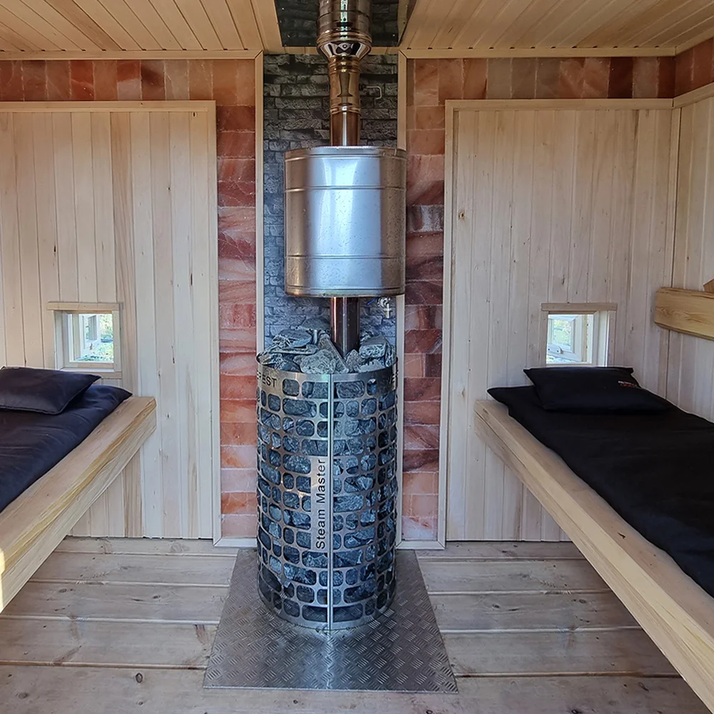 Внешний тепловой контур образован открытой каменкой в виде цилиндрической сетки, вмещающей в себя ок. 100 кг камней. Сетка сделана из стали, в новом минималистичном дизайне EVEREST.