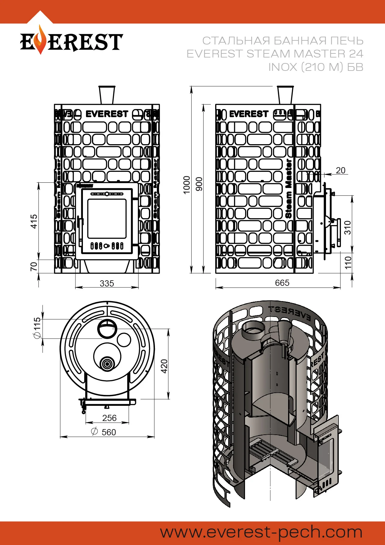 Печь для бани Эверест "Steam Master" 24 INOX (210М) б/в изготовлена из нержавеющей стали и предназначена для установки в частные и коммерческие бани с объёмами парных помещений от 12 до 24 м3.Печь и сетка внешней каменки цилиндрической формы, компактная и удобно размещаемая в парилке. Выносной тоннель при монтаже печи проводится через стену и предполагает обслуживание печи из смежного помещения.Конструкция печи включает в себя закрытую каменку из нержавейки марки AISI 430 толщиной 4 мм, расположенную в верхней части топки. Каменка оригинальной формы размещена прямо на пути пламени и дымовых газов, что позволяет нагреть камни до температур свыше 600 ºС.Для эффективного сгорания топлива по боковым сторонам топки предусмотрены два канала для подачи воздуха на вторичное горение.Каменка рассчитана на 15-20 кг камня для бани мелкой и средней фракции. Воду в каменку подают с помощью заливной воронки, через которую вода попадает примерно в середину массива уложенных камней. Пар выходит через верхнюю крышку с отверстиями. На этой крышке крепится воронка для подачи водыКрышка печи и каменка – съёмные элементы, позволяют ухаживать за топкой и каменкой. Форма каменки со скосом в передней части исключает накопление сажи сверху, на каменке. Сажа из дымохода по переднему краю каменки попадает в топку, где сгорает, не причиняя вреда печи, каменке и дымоходу.Печь подключается к дымоходу диаметром 115 мм.Стальная дверь артикул 210М оснащена системами подачи воздуха в колосниковую зону и на стекло. С помощью размещённых в двери отверстий можно регулировать интенсивность горения дров и обеспечивать чистоту стекла.Внешний тепловой контур образован открытой каменкой в виде цилиндрической сетки, вмещающей в себя ок. 100 кг камней. Сетка сделана из стали, в новом минималистичном дизайне EVEREST.