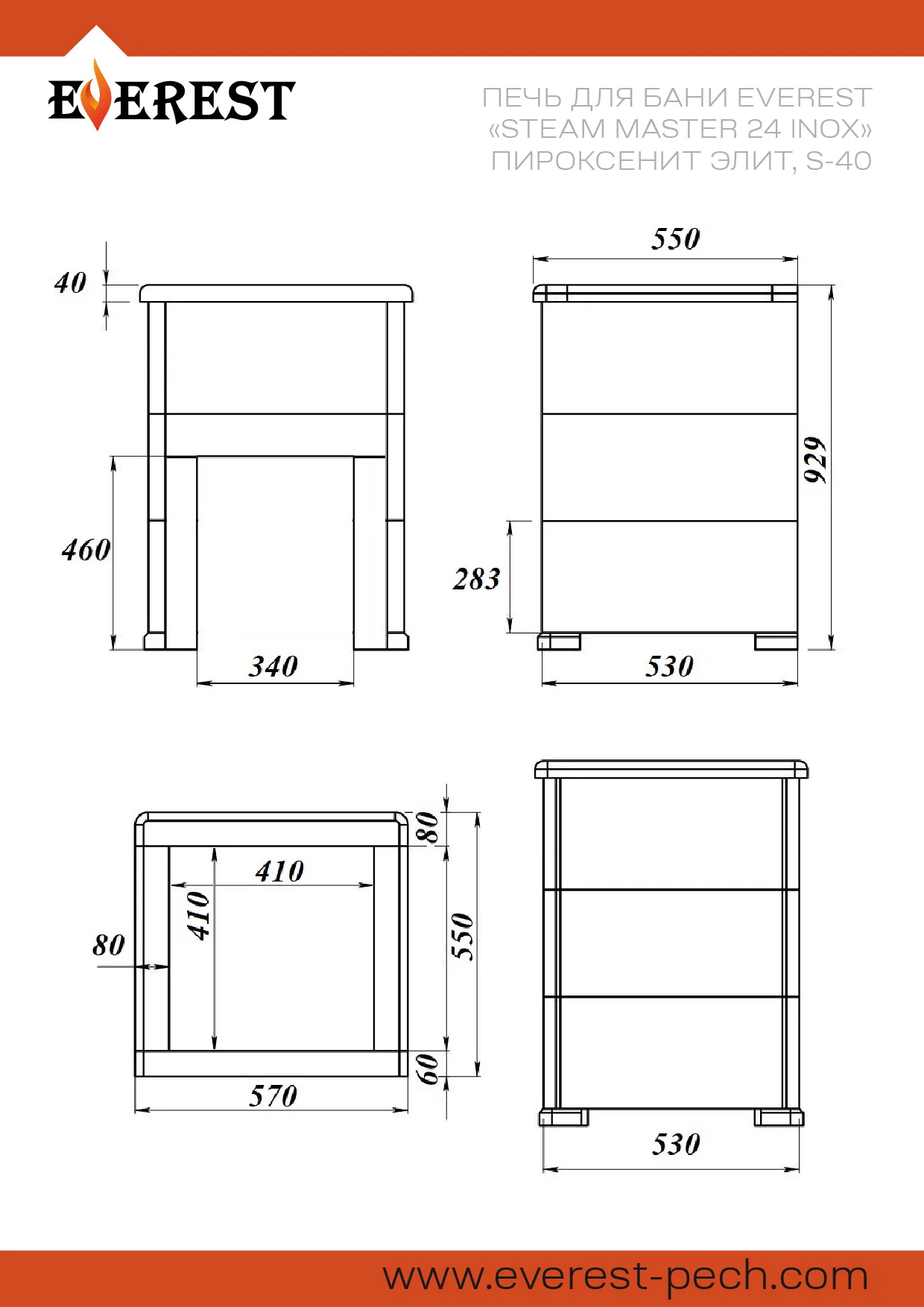 Печь для бани Эверест "Steam Master 24 INOX" Пироксенит Элит, S-40 изготовлена из нержавеющей стали. Печь предназначена для установки в частные и коммерческие бани с объёмами парных помещений до 24 м³.