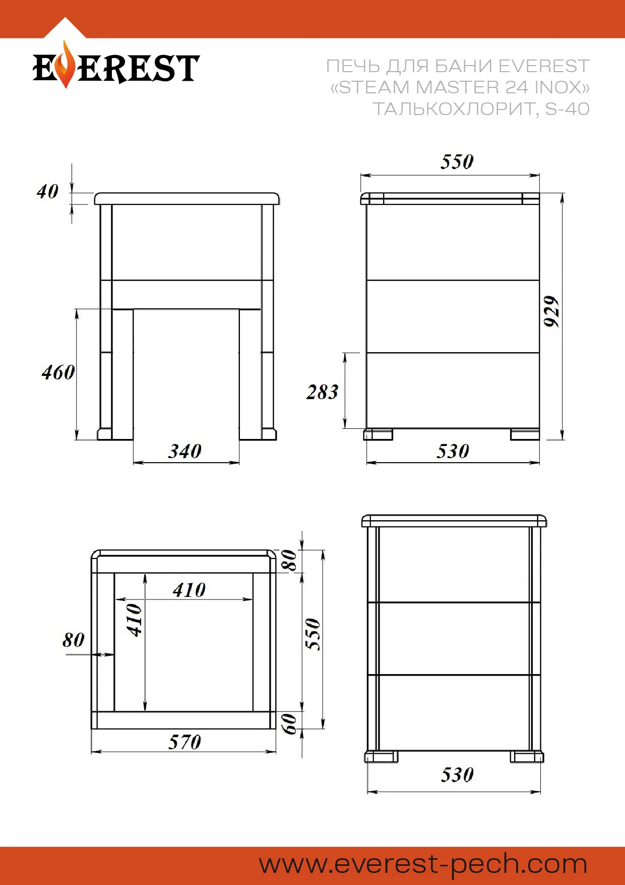Печь для бани Эверест "Steam Master 24 INOX" Талькохлорит, S-40 изготовлена из нержавеющей стали. Печь предназначена для установки в частные и коммерческие бани с объёмами парных помещений до 24 м³.