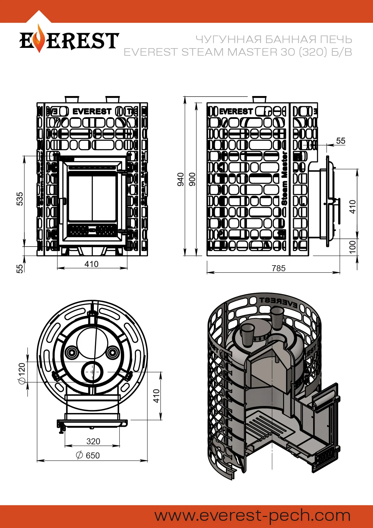 Печь для бани Эверест "Steam Master" 30 (320) ЧУГУН б/в предназначена для нагрева помещений и получения пара в парных объёмом до 30 кубических метров.