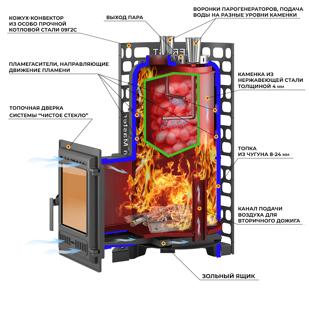 Печь изготовлена из качественного чугуна и отличается интересной конструкцией. Толщина металла составляет от 8 до 24 мм в зависимости от детали печи (наиболее термонагруженные участки имеют большую толщину чугуна).Топочная камера печи – сборная, состоит из трёх деталей, соединяемых между собой на болтах. Вертикальные швы по краю деталей соединяются по принципу паз-гребень, что обеспечивает высокую герметичность топки и минимальную деформацию даже при длительном нагреве. Соединение не требует применения уплотнителей шва, достаточно только герметика.Верхняя часть топки изготовлена из чугунных колец. В печи Эверест "Steam Master" 24 (320) ЧУГУН между топкой и крышкой размещено одно кольцо высотой 120 мм.На дне цилиндрической топочной камеры уложен чугунный колосник размером 20 на 30 см, обеспечивающий хороший доступ воздуха для горения. Подача воздуха происходит через щелевидные отверстия в двери печи.Для полного сгорания топлива в топке устроены каналы вторичного дожига, подающие воздух из поддувала в верхние точки камеры, в места скопления разогретых газов. Это обеспечивает максимальную эффективность горения и высокий КПД печи Эверест "Steam Master" 24 (320) ЧУГУН.Чугунная дверь артикул 320 имеет верхнюю и нижнюю системы подачи воздуха. За счёт работы обеих систем регулируется интенсивность горения и обеспечивается чистота стекла во время работы печи. Плотный контакт двери и рамки делает топочное пространство максимально герметичным.Закрытая каменка печи изготовлена из нержавеющей стали марки AISI 430 толщиной 4 мм. Каменка размещается прямо на пути пламени и горящих газов, что позволяет нагревать камни со всех сторон и быстро достигать температуры 450-500 градусов по Цельсию.Форма каменки обеспечивает максимальное снятие энергии с горящих в топке дров. Объём топки рассчитан на размещение 25-40 кг камней для бани. Выход пара происходит через верхнюю крышку с отверстиями.Для подачи воды в каменку предусмотрены 2 заливные воронки, направляющие воду в нижний и средний ярус заклада каменки. Это позволяет легче управлять паром и получать пар разной степени насыщенности.Печь Эверест «Steam Master» 24(320) ЧУГУН изготовлена с удлинённым топочным тоннелем и рассчитана на вывод двери топки в соседнее помещение при наличии стены толщиной до 280 мм. Рамка двери крепится к топочному тоннелю, состоящему из двух чугунных элементов.