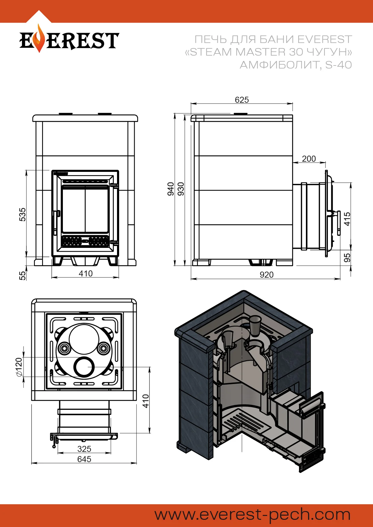 Банная печь Эверест "Steam Master" 30 ЧУГУН" Амфиболит, S-40 предназначена для нагрева помещений и получения пара в парных объёмом до 30м³. Печь изготовлена из качественного чугуна и отличается интересной конструкцией.