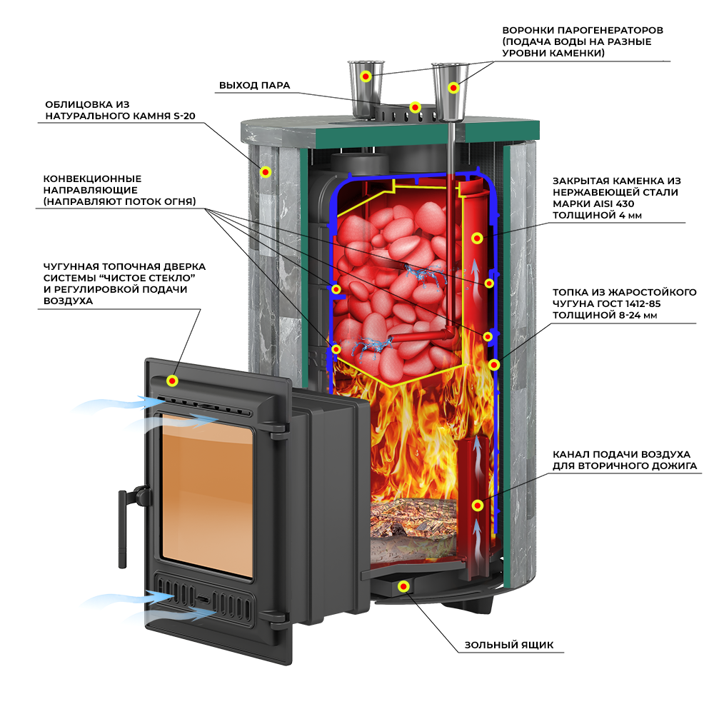 Закрытая каменка печи изготовлена из нержавеющей стали марки AISI 430 толщиной 4 мм. Каменка размещается прямо на пути пламени и горящих газов, что позволяет нагревать камни со всех сторон и быстро достигать температуры 450-500 градусов по Цельсию. Форма каменки обеспечивает максимальное снятие энергии с горящих в топке дров. Объём топки рассчитан на размещение 25-40 кг камней для бани. Для подачи воды в каменку предусмотрены 2 заливные воронки, направляющие воду в нижний и средний ярус заклада каменки. Это позволяет легче управлять паром и получать пар разной степени насыщенности. Облицовка сделана из отдельных планок или полос натурального пироксенита элит – брашированного пироксенита тёмно-серого оттенка.