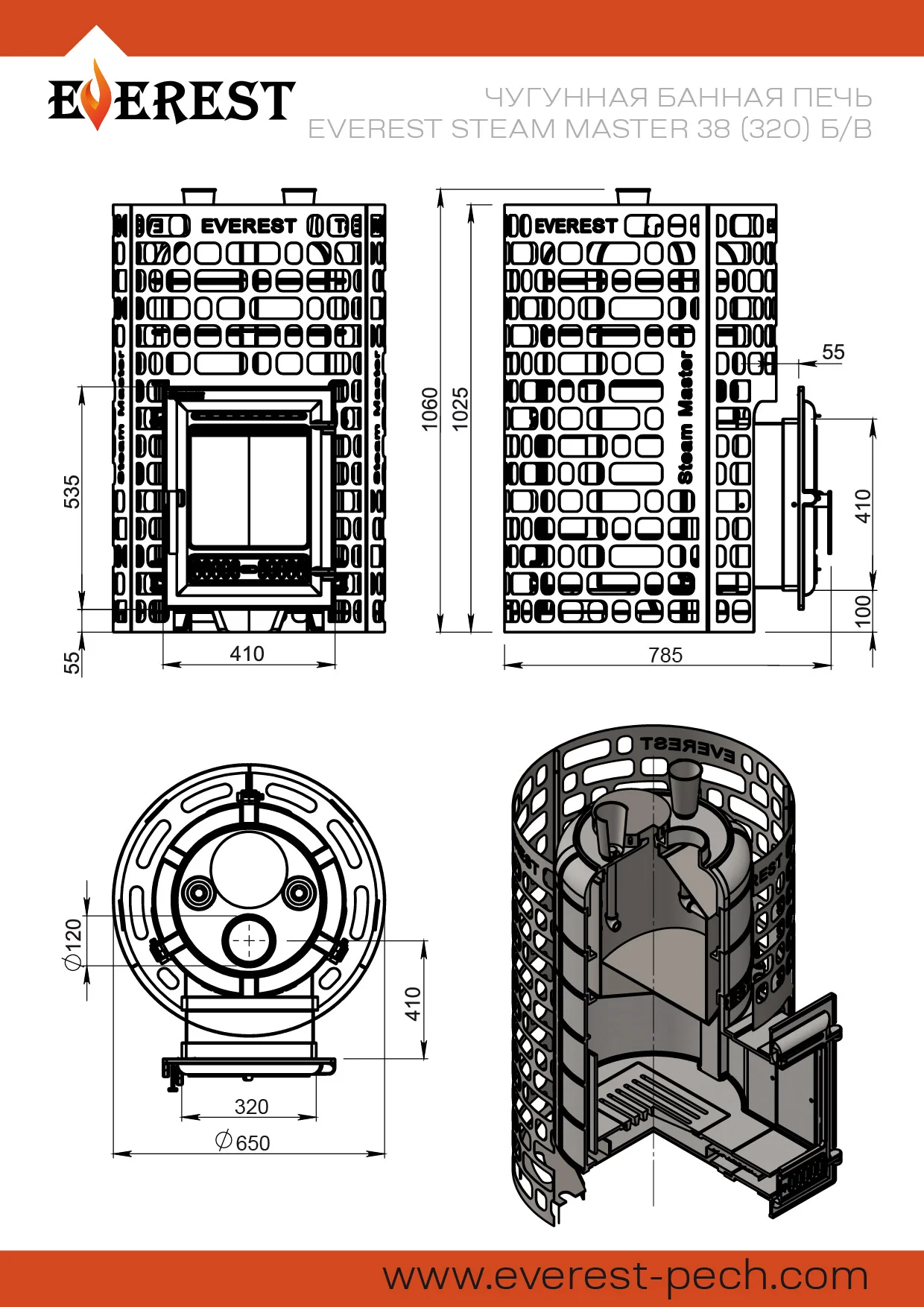Печь изготовлена из качественного чугуна и отличается интересной конструкцией. Толщина металла составляет от 8 до 24 мм в зависимости от детали печи (наиболее термонагруженные участки имеют большую толщину чугуна).Топочная камера печи – сборная, состоит из трёх деталей, соединяемых между собой на болтах. Вертикальные швы по краю деталей соединяются по принципу паз-гребень, что обеспечивает высокую герметичность топки и минимальную деформацию даже при длительном нагреве. Соединение не требует применения уплотнителей шва, достаточно только герметика.Верхняя часть топки изготовлена из чугунных колец. В печи Эверест "Steam Master" 38 (320) ЧУГУН б/в между топкой и крышкой размещены два кольца высотой 120 мм.На дне цилиндрической топочной камеры уложен чугунный колосник размером 20 на 30 см, обеспечивающий хороший доступ воздуха для горения. Подача воздуха происходит через щелевидные отверстия в двери печи.Для полного сгорания топлива в топке устроены каналы вторичного дожига, подающие воздух из поддувала в верхние точки камеры, в места скопления разогретых газов. Это обеспечивает максимальную эффективность горения и высокий КПД печи Эверест "Steam Master" 38 (320) ЧУГУН б/в.Чугунная дверь артикул 320 имеет верхнюю и нижнюю системы подачи воздуха. За счёт работы обеих систем регулируется интенсивность горения и обеспечивается чистота стекла во время работы печи. Плотный контакт двери и рамки делает топочное пространство максимально герметичным.Закрытая каменка печи изготовлена из нержавеющей стали марки AISI 430 толщиной 4 мм. Каменка размещается прямо на пути пламени и горящих газов, что позволяет нагревать камни со всех сторон и быстро достигать температуры 450-500 градусов по Цельсию.Форма каменки обеспечивает максимальное снятие энергии с горящих в топке дров. Объём топки рассчитан на размещение 50-60 кг камней для бани. Выход пара происходит через верхнюю крышку с отверстиями.Для подачи воды в каменку предусмотрены 2 заливные воронки, направляющие воду в нижний и средний ярус заклада каменки. Это позволяет легче управлять паром и получать пар разной степени насыщенности.