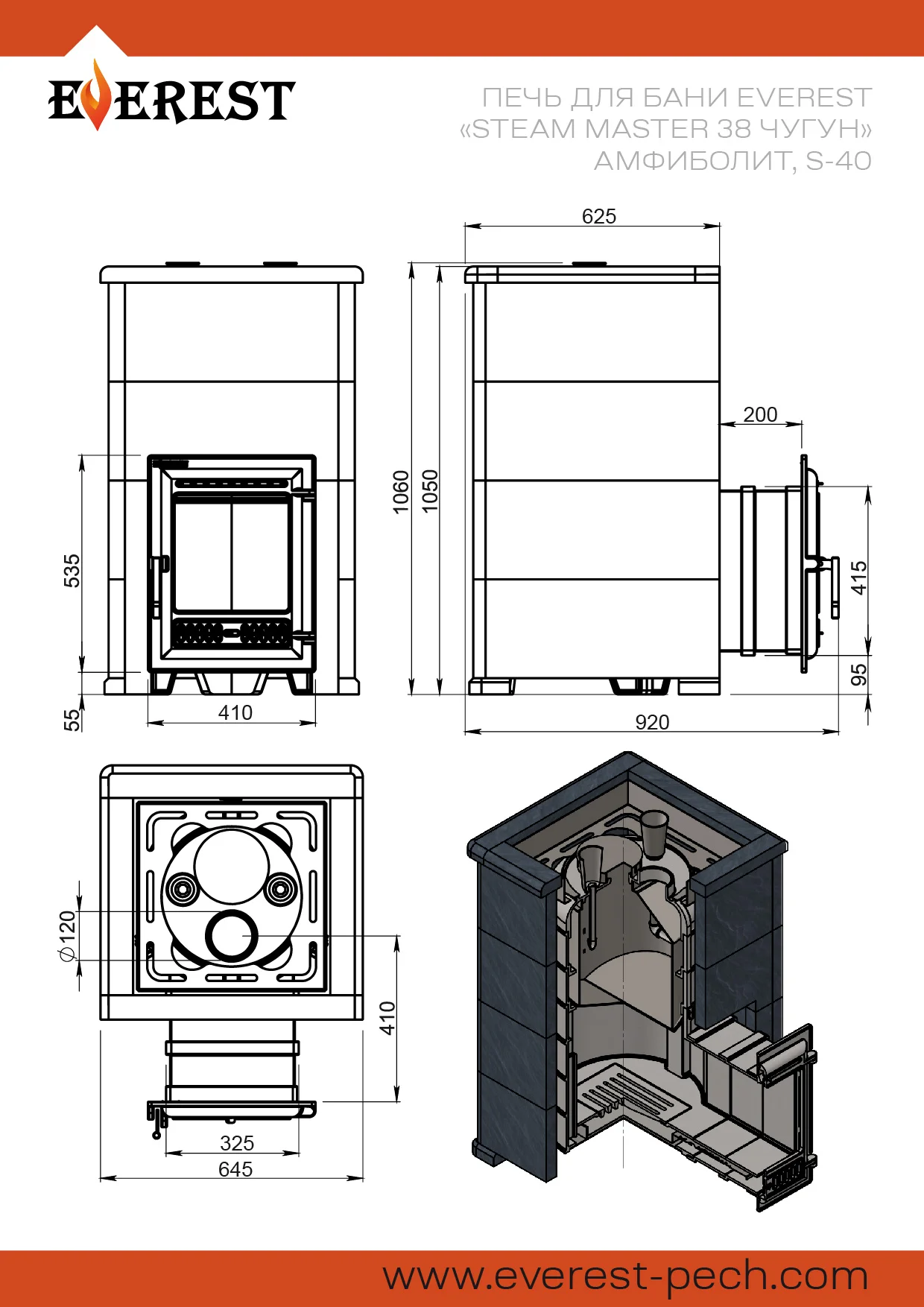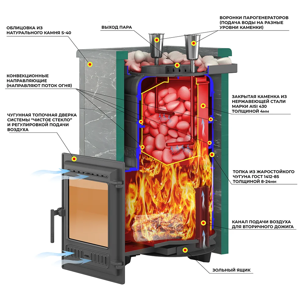 Топочная камера печи – сборная, состоит из трёх деталей, соединяемых между собой на болтах. Вертикальные швы по краю деталей соединяются по принципу паз-гребень, что обеспечивает высокую герметичность топки и минимальную деформацию даже при длительном нагреве. Соединение не требует применения уплотнителей шва, достаточно только герметика. Верхняя часть топки изготовлена из чугунных колец. В печи Эверест "Steam Master 38 ЧУГУН" Амфиболит, S-40 между топкой и крышкой размещено два кольца высотой 120 мм. Для полного сгорания топлива в топке устроены каналы вторичного дожига, подающие воздух из поддувала в верхние точки камеры, в места скопления разогретых газов.Чугунная дверь артикул 320 имеет верхнюю и нижнюю системы подачи воздуха. За счёт работы обеих систем регулируется интенсивность горения и обеспечивается чистота стекла во время работы печи.Закрытая каменка печи изготовлена из нержавеющей стали марки AISI 430 толщиной 4 мм. Каменка размещается прямо на пути пламени и горящих газов, что позволяет нагревать камни со всех сторон и быстро достигать температуры 450-500°C. Форма каменки обеспечивает максимальное снятие энергии с горящих в топке дров. Объём топки рассчитан на размещение 50-60 кг камней для бани. Для подачи воды в каменку предусмотрены 2 заливные воронки, направляющие воду в нижний и средний ярус заклада каменки. Это позволяет легче управлять паром и получать пар разной степени насыщенности.