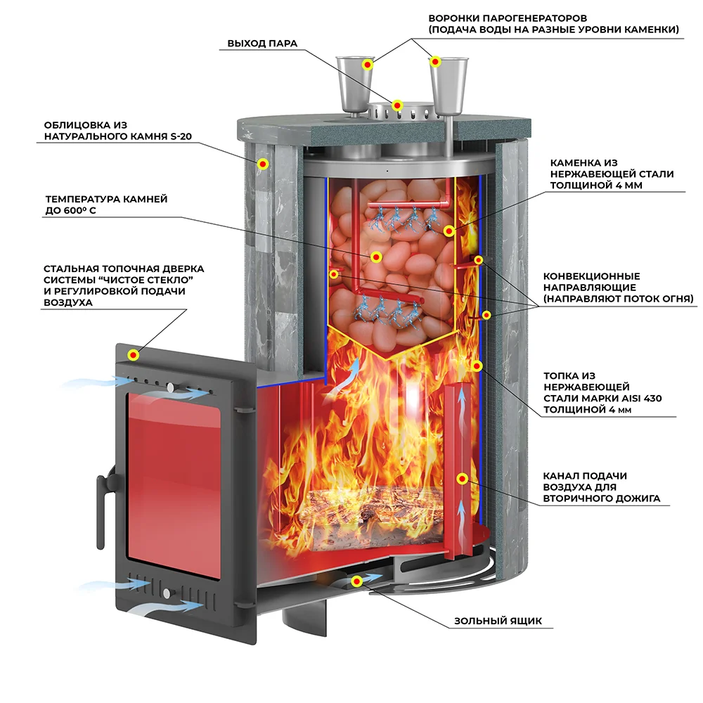Конструкция печи включает в себя закрытую каменку из нержавейки марки AISI-430 толщиной 4 мм, расположенную в верхней части топки. Каменка размещена прямо на пути пламени и дымовых газов, что позволяет нагреть камни до температур свыше 600 градусов по Цельсию.