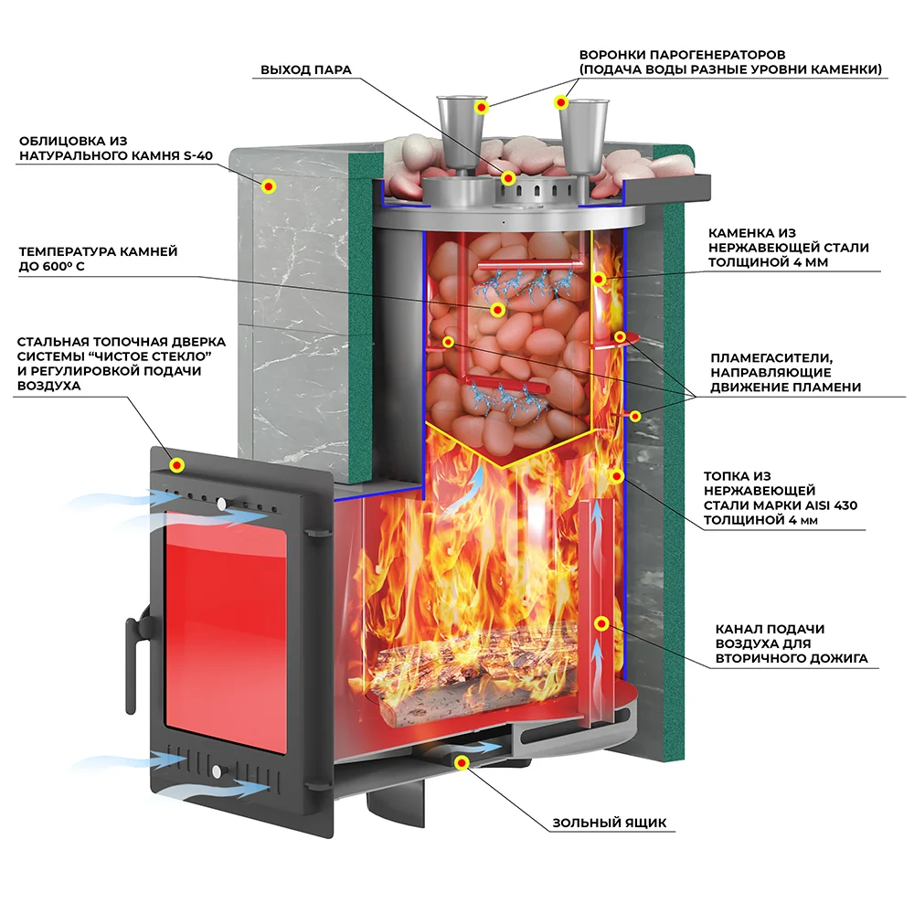 Конструкция печи включает в себя закрытую каменку из нержавейки марки AISI-430 толщиной 4 мм, расположенную в верхней части топки. Каменка размещена прямо на пути пламени и дымовых газов, что позволяет нагреть камни до температур свыше 600°C.
