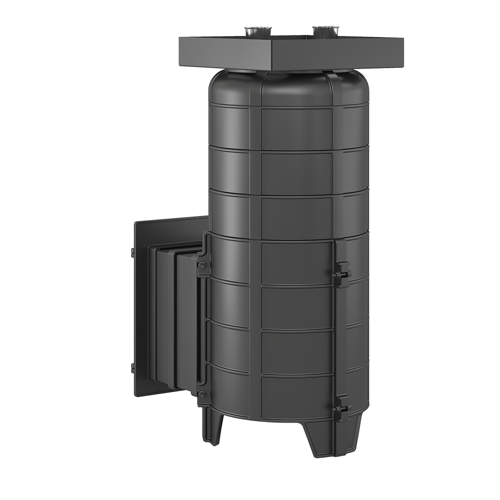 Форма каменки обеспечивает максимальное снятие энергии с горящих в топке дров. Объём топки рассчитан на размещение до 70 кг камней для бани. Выход пара происходит через верхнюю крышку с отверстиями.