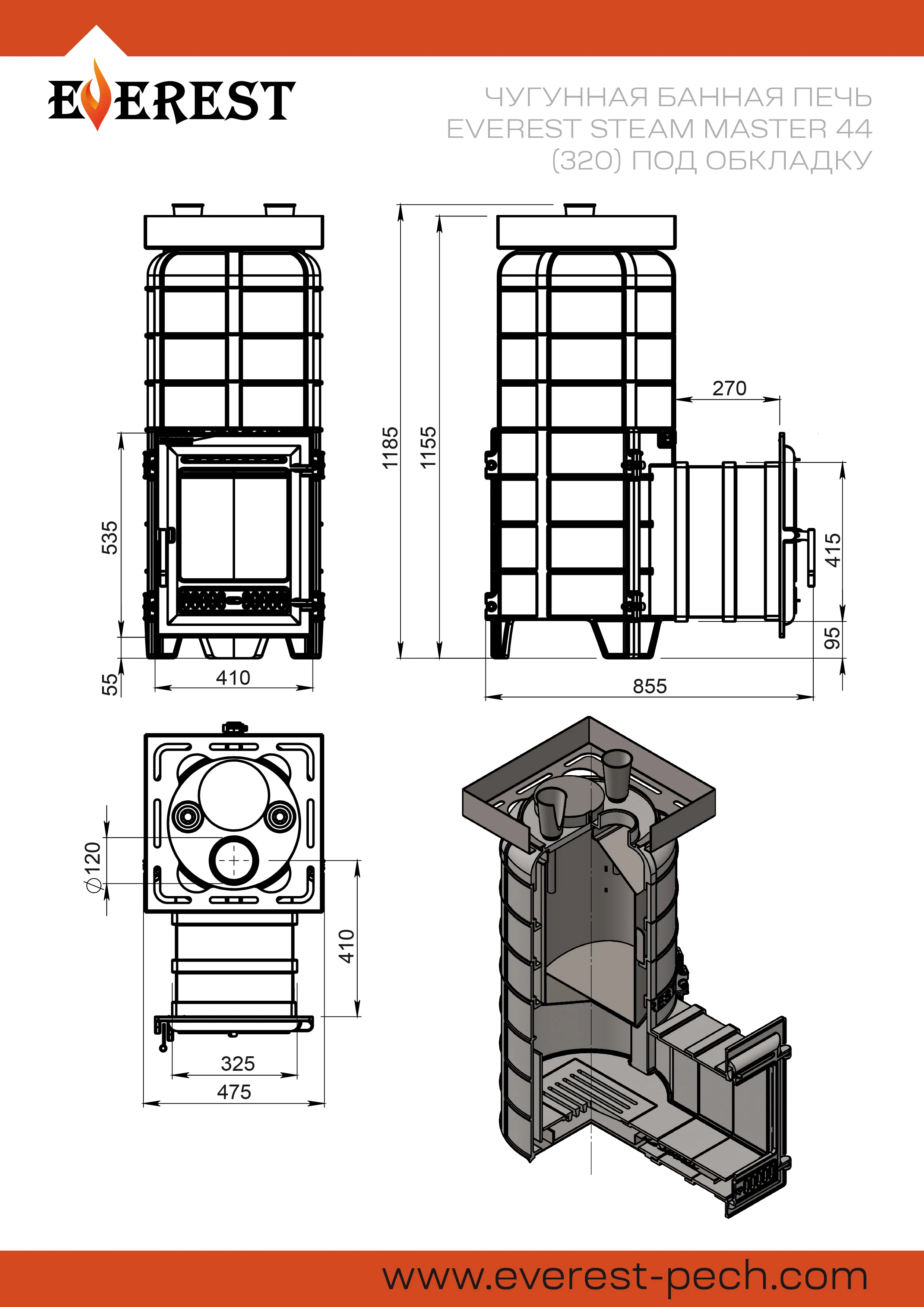 Банная печь Эверест «Steam Master» 44 (320) ЧУГУН (под обкладку) предназначена для нагрева помещений и получения пара в парных объёмом до 44 кубических метров.