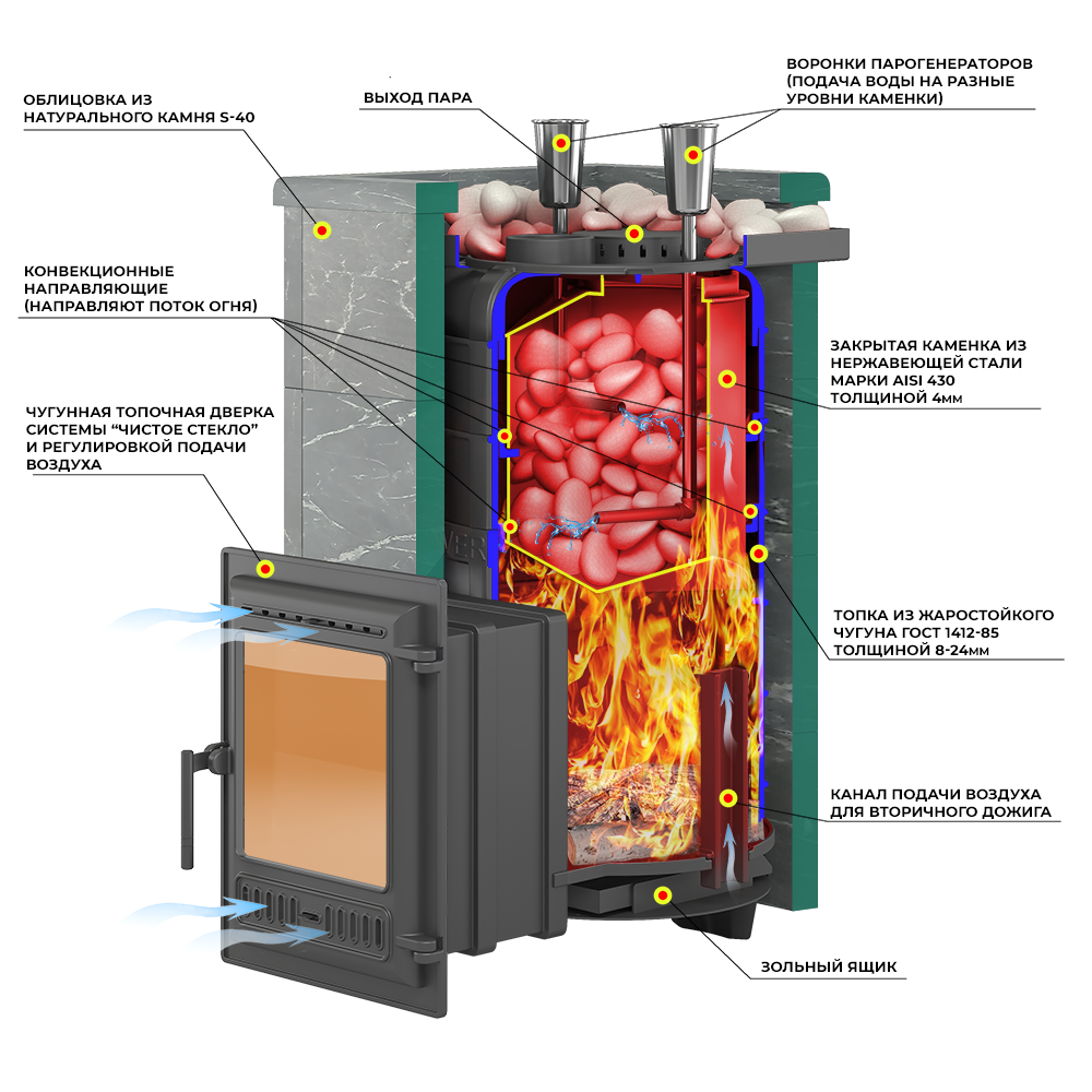 Топочная камера печи – сборная, состоит из трёх деталей, соединяемых между собой на болтах. Вертикальные швы по краю деталей соединяются по принципу паз-гребень, что обеспечивает высокую герметичность топки и минимальную деформацию даже при длительном нагреве. Соединение не требует применения уплотнителей шва, достаточно только герметика. Верхняя часть топки изготовлена из чугунных колец. В печи Эверест "Steam Master" 44 ЧУГУН Пироксенит Элит, S-40 между топкой и крышкой размещено два кольца высотой 120 мм. Для полного сгорания топлива в топке устроены каналы вторичного дожига, подающие воздух из поддувала в верхние точки камеры, в места скопления разогретых газов.Чугунная дверь артикул 320 имеет верхнюю и нижнюю системы подачи воздуха. За счёт работы обеих систем регулируется интенсивность горения и обеспечивается чистота стекла во время работы печи.Закрытая каменка печи изготовлена из нержавеющей стали марки AISI 430 толщиной 4 мм. Каменка размещается прямо на пути пламени и горящих газов, что позволяет нагревать камни со всех сторон и быстро достигать температуры 450-500°C. Форма каменки обеспечивает максимальное снятие энергии с горящих в топке дров. Объём топки рассчитан на размещение 50-60 кг камней для бани. Для подачи воды в каменку предусмотрены 2 заливные воронки, направляющие воду в нижний и средний ярус заклада каменки. Это позволяет легче управлять паром и получать пар разной степени насыщенности.
