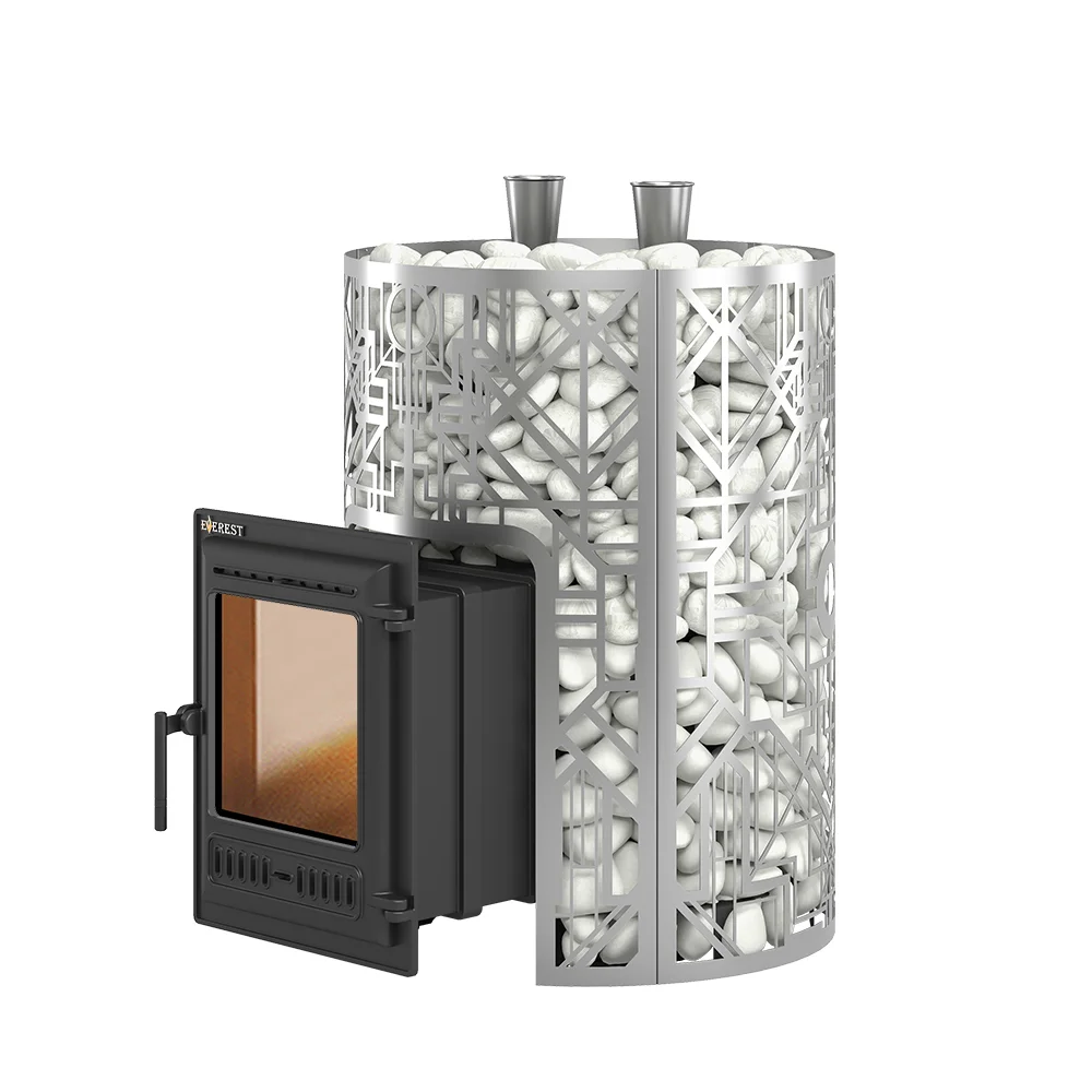Закрытая каменка печи изготовлена из нержавеющей стали марки AISI 430 толщиной 4 мм. Каменка размещается прямо на пути пламени и горящих газов, что позволяет нагревать камни со всех сторон и быстро достигать температуры 450-500°C.