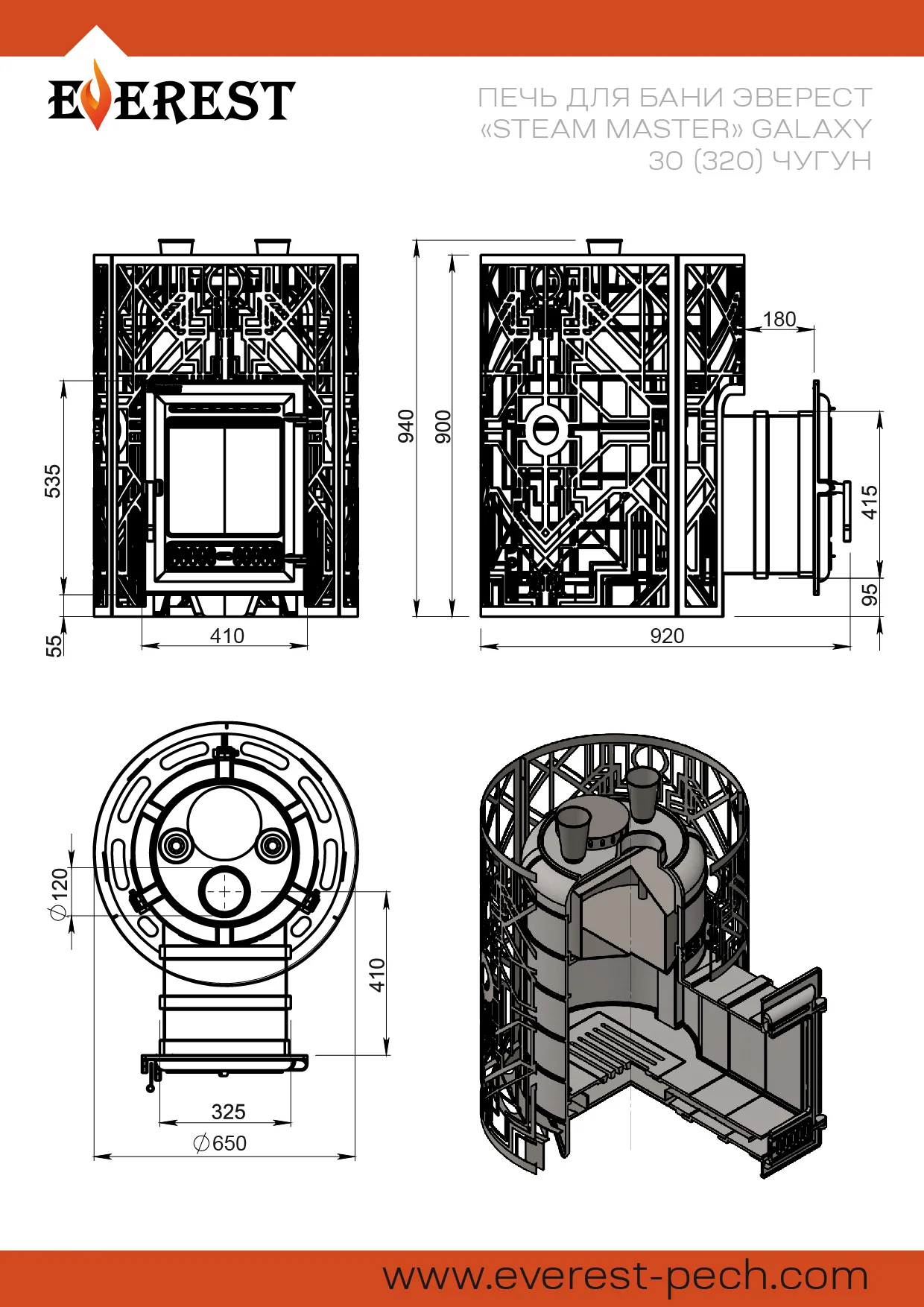 Банная печь Эверест "Steam Master" GALAXY 30 (320) ЧУГУН предназначена для нагрева помещений и получения пара в парных объёмом до 30 м³.