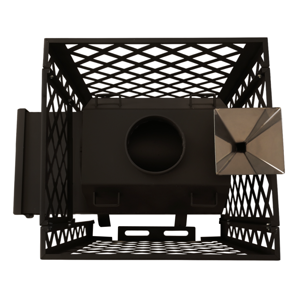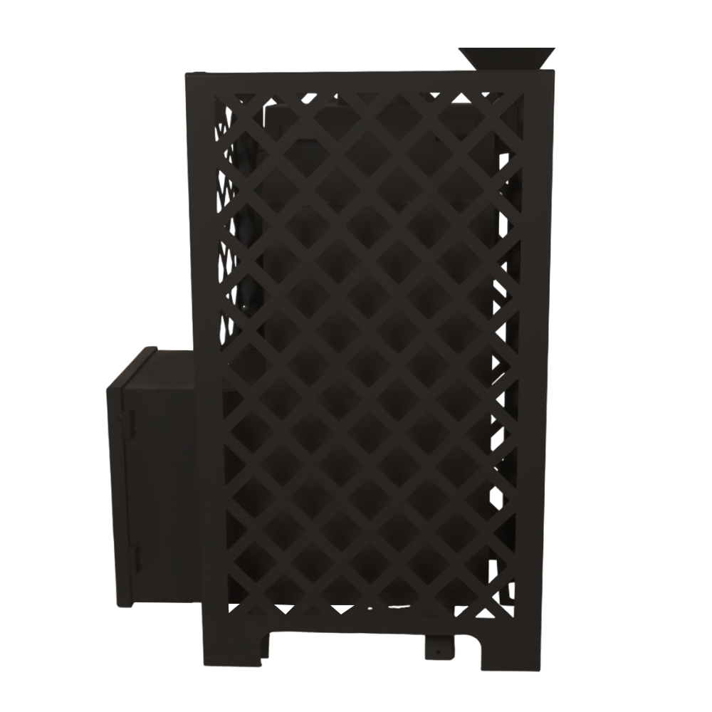 Стальной кожух-конвектор значительно ускоряет нагревание воздуха в парилке за счет образуемого им мощного воздушного потока. Топочная дверка с регулировкой подачи воздуха. Универсальный парогенератор проходит через каменку-трубу, обеспечивая получение мелкодисперсного пара. Глубокая невентилируемая каменка-труба из стали 09Г2С толщиной 4 мм прогревается открытым пламенем для максимального нагрева камней, заложенных в нее и выполняет роль пламегасителя. Большая масса камней, закладываемых в сетку-кожух печи, обеспечивает стабильность температуры в парилке и является мощным парогенератором. Длинная колосниковая решетка из массивного литьевого чугуна обеспечивает равномерное и мощное горение дров. Съёмное дно топочной камеры облегчает уход за печью и контроль состояния поддувального пространства.