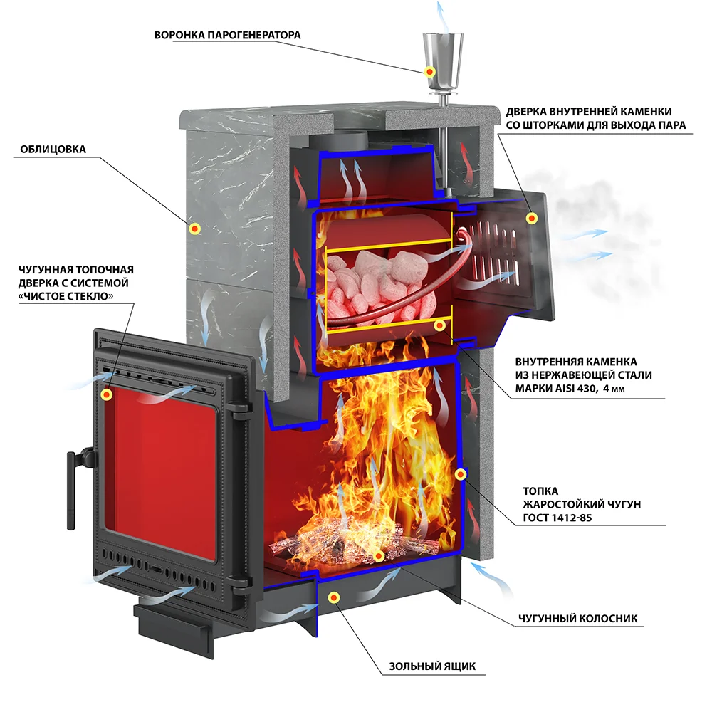 В комплект с чугунной банной печью «Легенда Русский пар 18 (505) Next» в облицовке из натурального камня.В комплект входит: