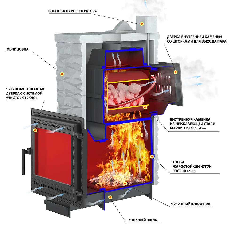 Печь «Легенда Русский Пар 24 (505) Next» предназначена для получения мелкодисперсного пара, без которого невозможно представить настоящую русскую баню. Этот полезный пар, который не обжигает дыхательные пути, благотворно влияет на состояние организма в целом, позволяет в полной мере наслаждаться банными процедурами. Получение мелкодисперсного пара становится возможным благодаря наличию у печи «Легенда Русский Пар 24 (505) Next» закрытой каменки.