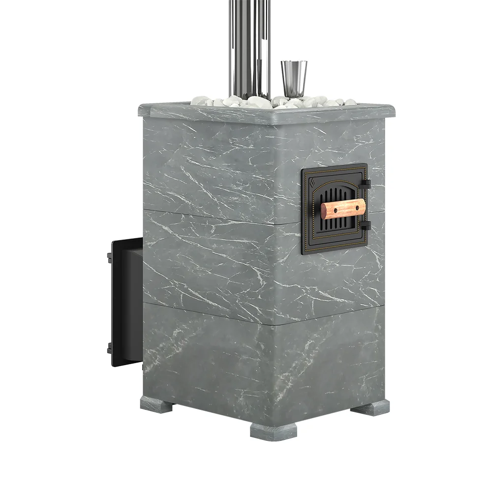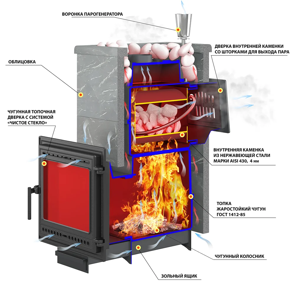 Данную модель печи отличает от аналогов то, что закрытая каменка расположена внутри топки. Это позволяет максимально быстро и хорошо прогревать камни, которые расположены внутри каменки. На камни через специальную трубку с отверстиями поддается вода, которая моментально испаряется, превращаясь в мелкодисперсный пар.