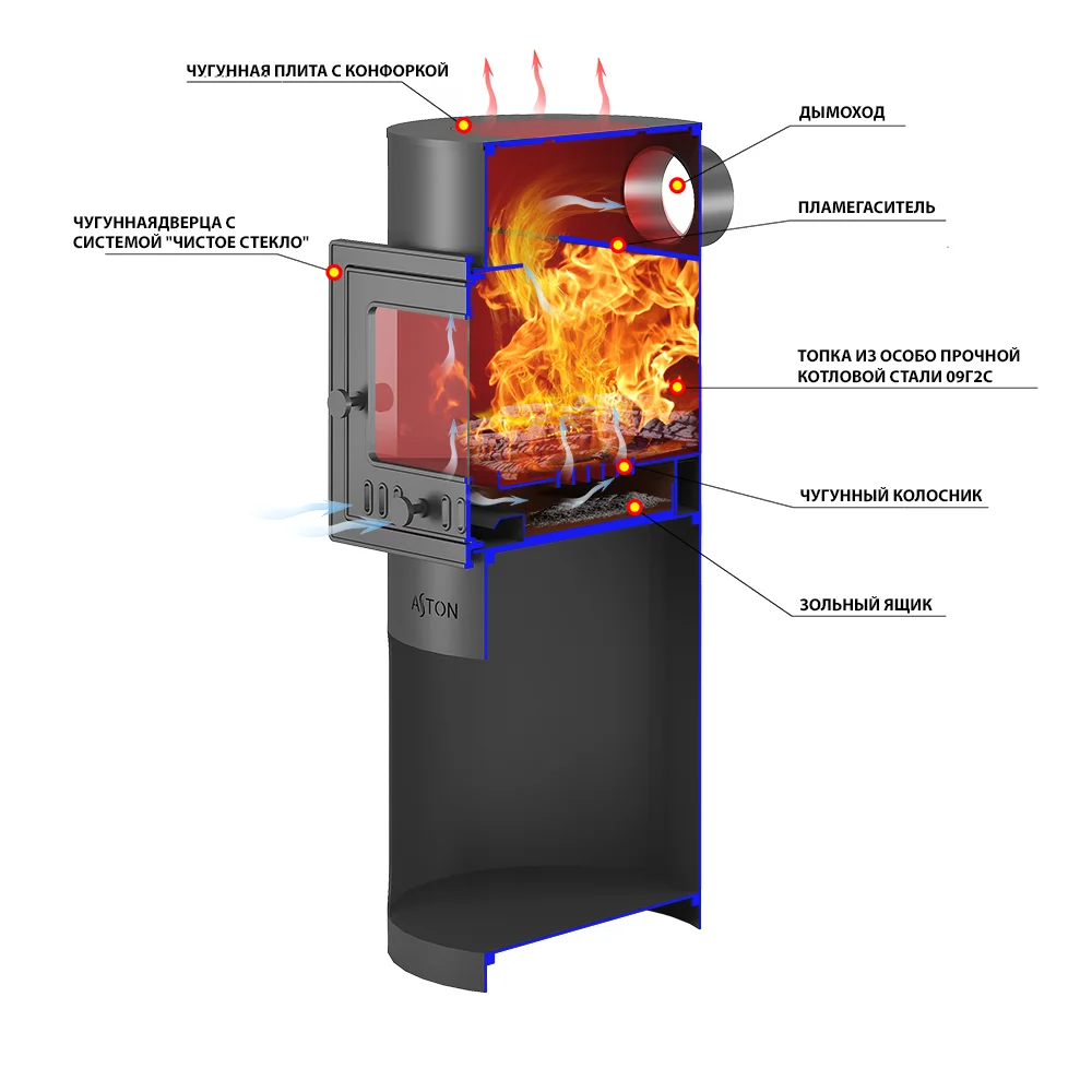 Печь оснащена чугунной дверью артикул ДТ-4С Астон с возможностью регулирования подачи воздуха и силы горения огня. Диагональ стекла – 21 см. Стеклокерамика рассчитана на температуры до 650°C.