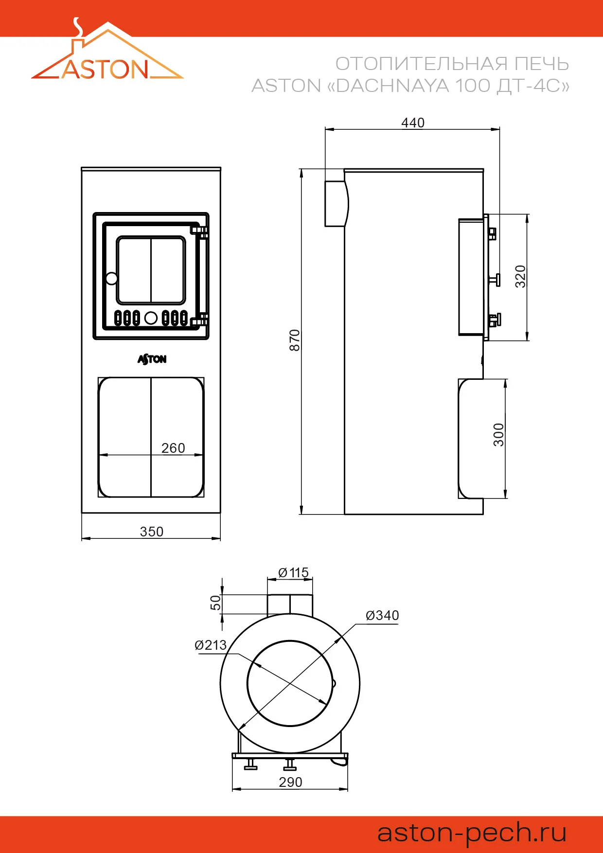 Отопительная печь ASTON " Dachnaya 100" ДТ-4С имеет цилиндрическую форму, с удобной остеклённой чугунной дверью и съёмной верхней конфоркой из чугуна. Аккуратная, компактная и эстетичная печь рассчитана на прогрев помещений объёмом до 100 кубических метров. На печи можно готовить или разогревать еду.