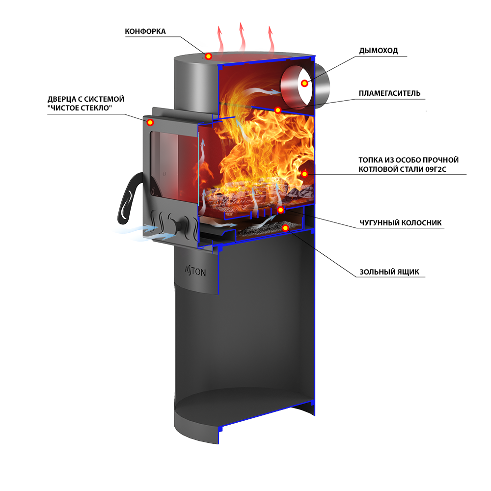 Печь оснащена стальной дверью Астон с возможностью регулирования подачи воздуха и силы горения огня. Стеклокерамика рассчитана на работу при температурах до 650°C.