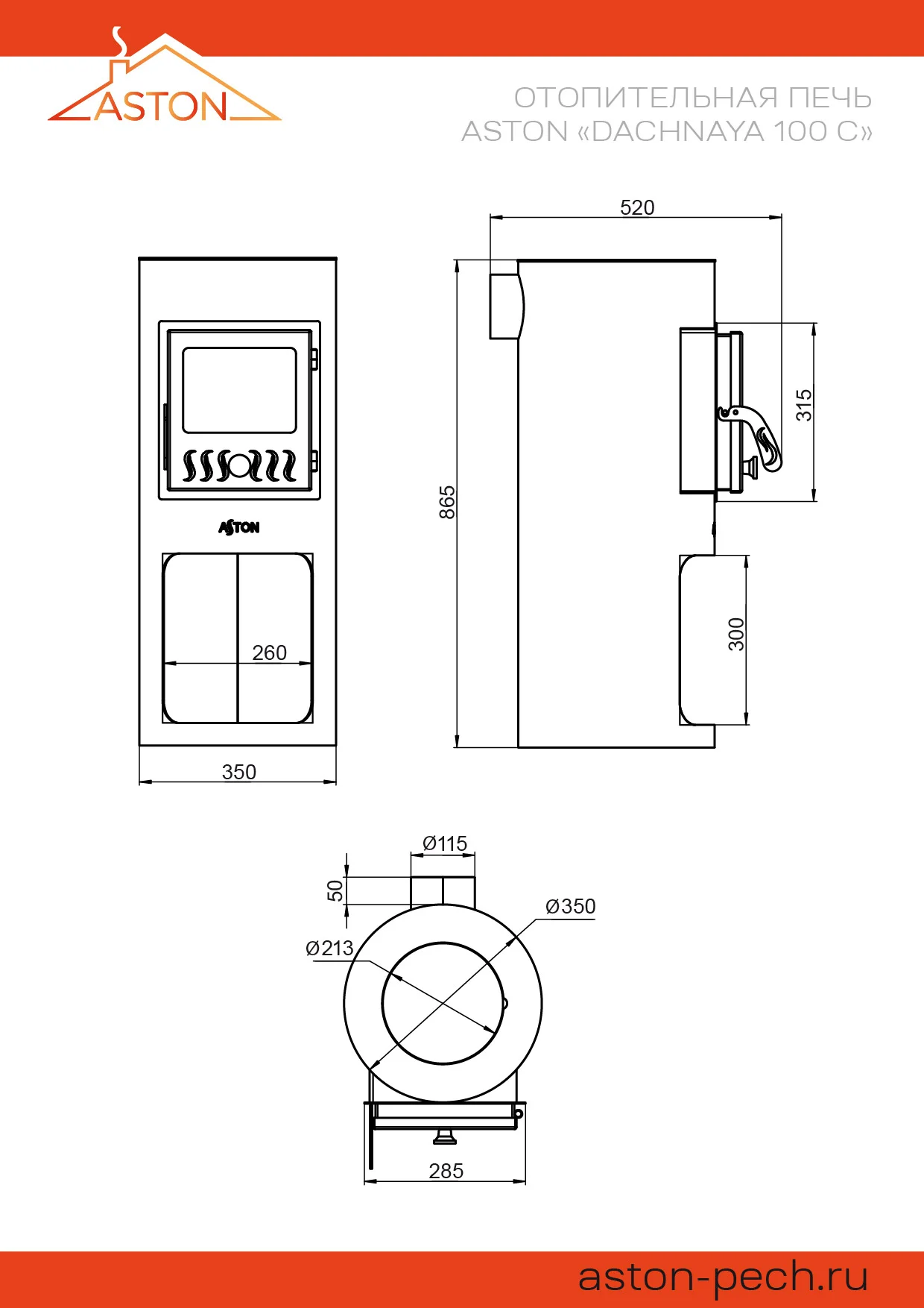Отопительная печь ASTON " Dachnaya 100" С имеет цилиндрическую форму, с удобной остеклённой стальной дверью и съёмной верхней конфоркой из особо прочной стали. Аккуратная, компактная и эстетичная печь рассчитана на прогрев помещений объёмом до 100 кубических метров. На печи можно готовить или разогревать еду.